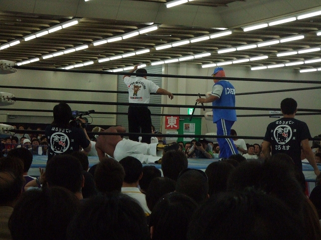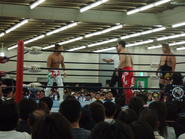 5.27 全日 神戸サンボーホール大会 昨日は梅田の四季劇場@ハービスで"オペラ座の怪人"を鑑賞。 四季の公演を見に行くのは"マンマミーア!"についで2回目。 やっぱり今回も面白かった~!( ・∀・)イイ! マダムジリーも綺麗やった。 怪人がオペラ座の地下にある湖にクリスティーヌを連れて行くシーンは幻想的で素晴らしい。 最後は怪人の悲しさが伝わってきたし。 そして今日は神戸で全日観戦だけど、その前にリングソウルで今後のチケット購入。 購入したのは、ミラノ対ライガーがある6月8日の新日@大阪府立、7月1日のドラゲー@神戸ワールド、7月17日のROH興行@大阪府立、7月22日のレッスルジャム@神戸サンボーホールとしめて2万円。 神戸ワールド以外は全部一番安い席にしたけど、カネかかるわ~。 今日の全日興業も一番安い自由席やったから、3時20分位に会場に入って、一番後ろの席の中で真ん中よりをゲット。 どうせ、イスの背もたれ部分に座って観戦した方が、中途半端に前に行くよりか見やすいし。 始まるまでipod聞きながら本読んでたら"会場グッズ売り場にて鈴木みのる選手が来場しています。"ってアナウンスがあったから、とりあえず写真を撮っとく。 第1試合 真田対T28 最後はT28がファイヤーバードスプラッシュで勝ち。 全日の新人でも、キャラ付きでデビューさせてくれるねんな~。 第2試合 YAMADA対菊タロー 最後はYAMADAがヌンチャクでレフェリーをどついて、その後ヌンチャクを菊タローに渡して痛がってる所をレフェリーが見るという、フロリダムーブでYAMADAの反則勝ち。 まあ面白かったけど、フィニッシュはフロリダそのままやったもんな。 そこが興ざめしてしまった。 第3試合 ペペ&ミゲル対荒谷&平井 カズのムーブは相変わらず綺麗だしキレがあるわ。 でもこの試合頑張ってたのは、荒谷でもなく平井。 一応神戸三宮育ちってアナウンスされてたし地元なんかな。 荒谷のお笑いムーブもありつつ、最後は平井がロックボトム的な技から横十字固めでペペからピン。 休憩中には、平井がパンフレットにサインしてくれるみたいやけど、グッズ売り場に来た健介にお客さんが総流れ。 ちょっと平井がかわいそうになるくらいやった。 第4試合 近藤対メンドーサ 試合前は闘牛士のマネをして挑発する論外。 試合自体は近ちゃん優勢のまま進み、論外のドロップキックがレフェリーに誤爆したところから、セコンド乱入。 ブラザーが入ってきて、ドロップキック挟み撃ちからビッグボーイを狙うも、カズとTAKAが論外に加勢。 ブラザーを落として近ちゃんに3人同時トラースキック。 その後近ちゃんもザ☆オリジナルを論外に決めて、キングコングラリアットを狙うが、これをかわした論外が丸め込んで勝利。 試合後に "おいおい、近藤君。いつまでチャンピオン気取りでいるんだよ。" "来月から始まるジュニアのリーグ戦に出ないつもりなのか?" と挑発すれば "(論外に向かって)オマエはいいや。カズにTAKA。オマエらいつまでそんなのやってんだよ。" "オレが高めてきた全日本ジュニアの格をオマエらが下げてんだよ。" "分かったよ。ジュニアリーグ戦出てやるよ。" とジュニアリーグに出場することになった近ちゃん。 確かに、カズとTAKAもメキシコアミーゴスのギミックをいつまで続けるかは気になるところ。 中嶋君の持つ世界ジュニアへの挑戦者も、今日の土方が終わると、次はカズに出てほしいなぁ。 中嶋対カズなんか面白い試合になることは間違いないと思うねんけど。 第5試合 鈴木みのる&MAZADA対武藤&ハワイアン・ライオン やっぱりみのるの入場はお客さんも盛り上がる。 注目はみのると武藤の絡みやねんけど、今日はいきなりみのると武藤から始まる。 そこに注目が集まりすぎて、MAZADAとハワイアン・ライオンはやりにくそうではあったけど。 実際に武藤とみのるが絡むことはあまりなくて、試合は終始MAZADAとライオンがそれぞれ捕まる展開。 最後はみのるがライオンをゴッチ式パイルドライバーからスリーパーではなく足4の字でタップを奪い勝利。 ハワイアン・ライオンを今日初めて見たけど、今日はあまりいいとこ見れなかった気がする。 セミファイナル 中嶋対土方の世界ジュニア選手権試合 試合は10分までは土方が中嶋の左腕を集中的に攻める。 10分過ぎからはお互い得意なキックでの打撃戦に突入。 しかし、土方の座り込んでる中嶋君へのキックはいい音させるし痛そう。 中盤には中嶋も反撃を見せて、三角蹴りが見事にヒット。 終盤に土方がフィッシャーマンバスターを中嶋に見舞うが、中嶋も何とかカウント2で返して、2発目はDDTで切り返す。 最後は全てを返した中嶋が、ジャーマンからバックドロップホールド抱え込みジャーマンでピン。 王者中嶋君が2回目の防衛に成功。 まあ、土方が奪取できるとは思ってなかったから、近藤戦くらいのドキドキはなかってんけど、いい試合やったわ~。 ※どうやらフィニッシュはバックドロップホールドではないようで・・・。m(_ _)m メイン