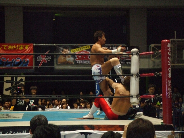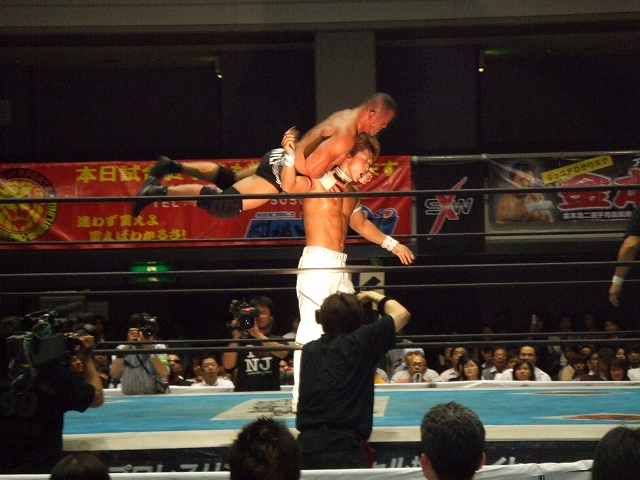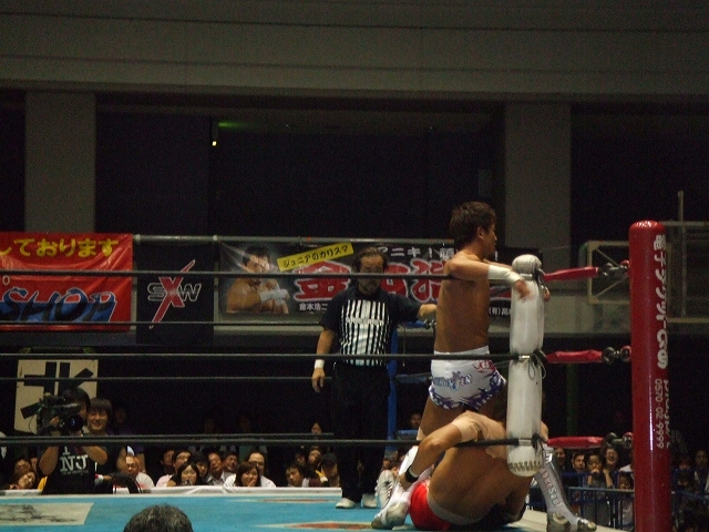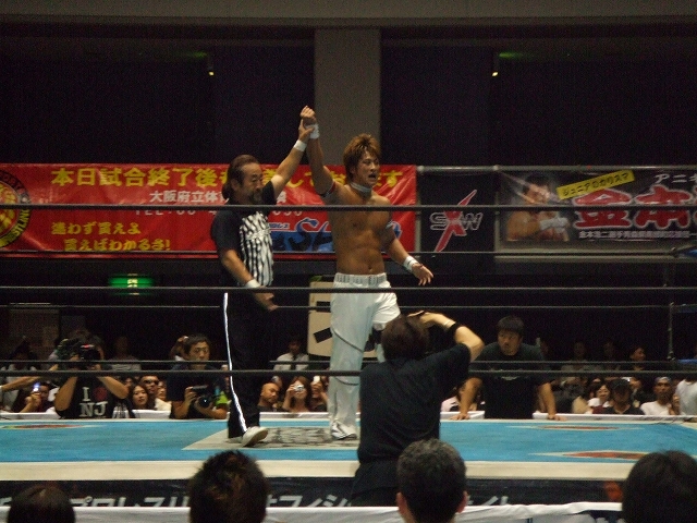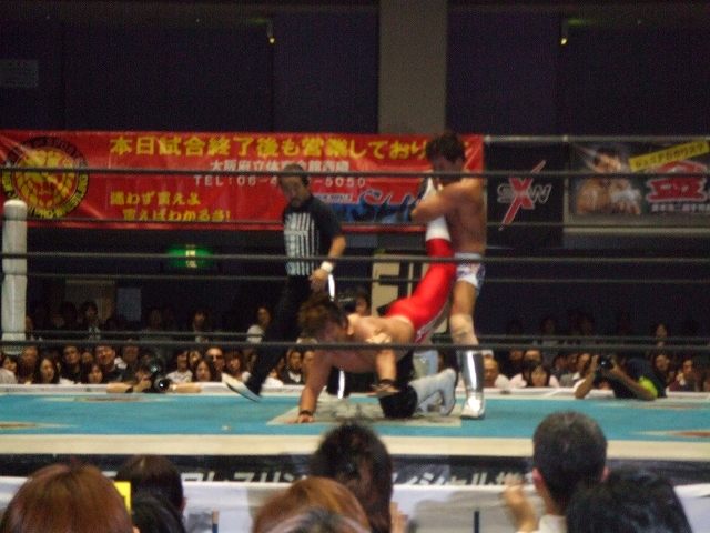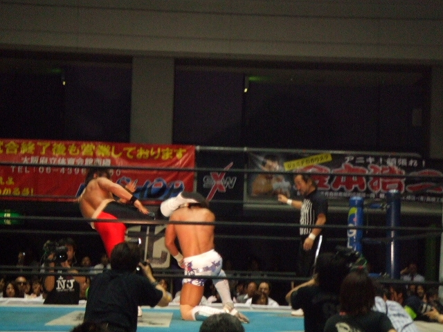 6.8 新日本大阪大会 さて今日は、BEST OF THE SUPER Jr開催中の新日本プロレス大阪体育会館第2競技場。 とりあえず会社終わり次第ダッシュで向かいましたが、会場に着いたのは19時過ぎ。 ちょうど越中の入場前くらい。 相変わらず越中人気は絶大。(笑) しかし、前の男の頭が邪魔でほとんど試合が見えん! 9列目という微妙な位置だったのもあるけど、これでは何もできないんで、とりあえずお目当てのミラノ対ライガーが始まるころに後ろに行って立ち見することにして、それまでは座って体を休めることに。 前の男の頭とリングを半々くらいで見ながら、越中&真壁対長州&中西と永田&山本対矢野&本間を観戦。 それが終了してからリング調整のための休憩が入ったんで、立ち見で見れそうな場所に移動。 ミラノ対ライガー 序盤のグラウンドの展開からペースを握ったのはライガー。 ミラノの左ヒザを集中的に攻めて、場外では鉄柵にニークラッシャー。 リング内にミラノを戻してからは、鉄柱に足を掛けさせてイスで殴打したり、ドラゴンスクリュー、足4の字固めで追い詰める。 後半には、ライガーがミラノにトップロープからの雪崩式ブレーンバスター、ライガーボム、再び雪崩式ブレーンバスターと攻めたてるが何とか返すミラノ。 その後も掌打、垂直落下ブレーンバスターで3カウント取られたと正直思ったけど、これも返すミラノ。 CTBを切り返すしてからバックドロップ連発でラッシュ。 エンポリオアルマニッシュを挟んで、バックドロップクラッチホールドでなんとライガーからピンフォール勝ち! いや~、試合のほとんどはライガーペースで進んでたし、8割方ライガー勝ちを予想してたんで、正直3カウント取れたときはびっくりした。 でも試合後のミラノの笑顔は、ドラゲー時代あまり見せてないような笑顔だったように思う。 ハルク対外道 新日本でのハルクはさすがにダンスは無し。 試合序盤はハルクが押してる展開だったが、ハイアングルのローブローであっさりと攻守交替。 しかしこのハイアングルローブローは出すタイミングといい、決まり方といい絶妙。 自分の中では、今日の3試合の中で一番うならされた技でした。( ̄o ̄)o オゥ! やっぱりこういう職人タイプのレスラー相手は中々ドラゲーにはいないもんね。 キングオブゲートにディック東郷が出てたけど、あんな感じのレスラーと試合できるというのは勉強になりそう。 外道は所々じらしたりと、試合運びが上手い。 ハルクが場外に外道を出してラ・ケブラーダを見せようとするも足をカットされてしまう。 その後鉄柵に外道を叩きつけてから、セカンドコーナーからのケブラーダは成功。 外道をリング内に戻してからも、スワンダイブのニールキック、マウスと外道を攻めたてるけど、アゴ砕きでリズムを狂わされるハルク。 終盤に凶器を持った外道に対してソバットを決めてから、前に一度かわされたE.V.Oでなんと外道からピンフォール勝ち! こちらはミラノとは違って、"ホントに3カウント入ったの?"と信じられない表情を見せたのが印象的。 でもこの試合はミラノの試合以上にハルクが勝てるとは思ってなかったから、3カウント取った瞬間についガッツポーズを決めてしまったほどいい試合やった~。 稔対金本 結論からいうと、最後は金本のアンクルホールドで稔がギブアップで金本の勝ち。 でも、この日の興行の中でもダントツのベストバウトを見せてくれた試合。 序盤のグラウンド、中盤のバチバチから雪崩式の技連発、終盤の関節技の切り返し合戦と見所が満載。 終盤の稔のミノルスペシャルと、金本のアンクルホールドの応酬は、言いすぎになってしまうかもしれへんけど、カート君とベノワの試合を見てるような印象を受けたほど。 やっぱりさすが新日ジュニアのトップは違うわ~と一人で感心。 試合内容がすばらしかっただけに、つい試合後に鉄柵の所まで行って写真とってたら、金本がリングを回ってファンとハイタッチ。 もちろん自分も参加。ワーイε=ヾ(*・∀・)/ 今日の興行自体は前半は殆ど見てない。 マトモに観戦したのは最後の3試合のみやけど、面白かったわ~。 もちろんミラノとハルクが勝ってくれたのはうれしいけど、メインの試合の質の高さで今日は満足。 そういえば、ワールドではかなりの確率でCIMA対ライガーは決定してるようなもんやけど、今日ミラノがライガーに勝ってしまったし、CIMAも負けは許されへんな。 ハルクは邪道の相方の外道に勝ってるし、ドラゲーに帰ってきたらドリームゲート挑戦の資格はあるかな。 その前に信悟越えをもう一回してほしいけど。 さて明日はジャッジメントデイ。 NBAファイナルも始まってるし、忙し~。(汗) PR