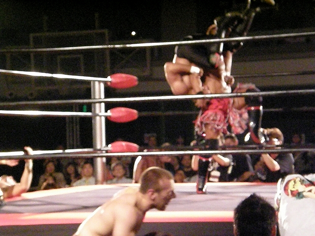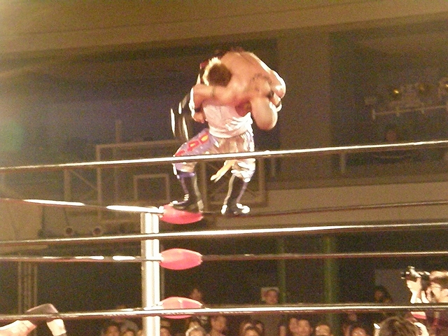 信悟はエプロンからどっちかのブリスコ(違いが分からないんで以下ブリスコ)に向けて場外へヒーロ。