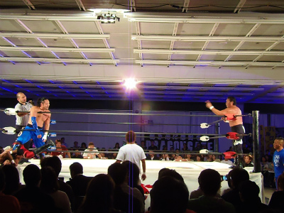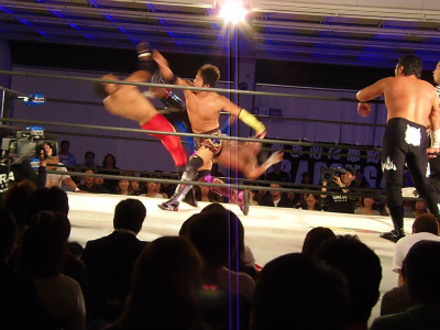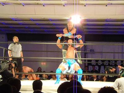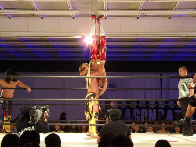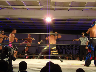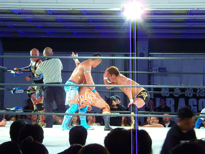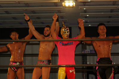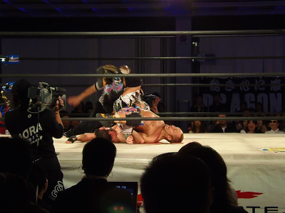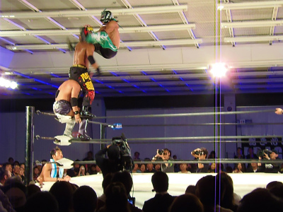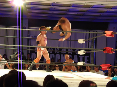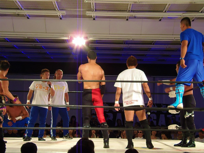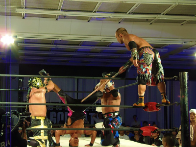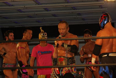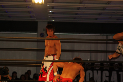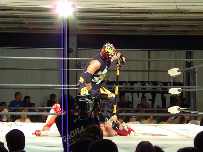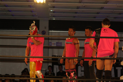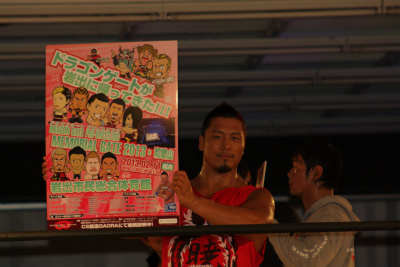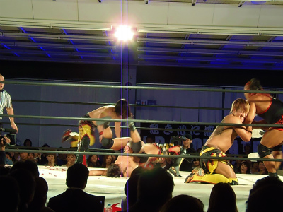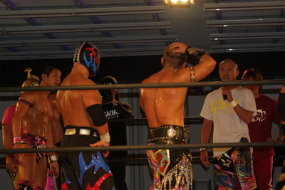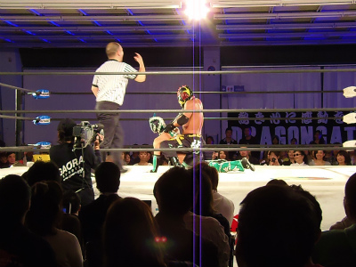 【チャンスを】しゃちほこBOY【掴むか?】~10.28 兵庫・神戸サンボーホール~ 昨日は神戸サンボーホール大会。 前日の岡山大会にてW-1インターナショナルに加入したしゃちほこBOYの自己主張が始まった。 第0試合 しゃちほこBOY&琴香 VS Mr.キューキュー・豊中ドルフィン&富永千浩 ユニットに加入したしゃちは試合でも溌剌としたファイト。 胸板へのチョップはいい音させてたし、不知火でトミーを追い込むと、最後は琴香のダイビングフットスタンプからムーンサルトプレスを決めてトミーから勝利。 第1試合前にW-1インターナショナルが登場しMC。 吉野からユニット加入の経緯を説明されたしゃちほこBOY。 土井ちゃんがお客さんに対して「しゃーち!しゃーち!」コールを促すが、吉野からは 「「ボーイ!ボーイ!」というコールを受けることもあるし、どっちがええかな?」 間を取って「ほーこ!ほーこ」にしようか。」(吉野) 等ほんわかした雰囲気。 結局どっちにするのかはこの日決まらなかった…。 その後しゃち本人からW-1加入の意気込み。 「これからはW-1インターナショナルのメンバーの一員として、自分の力を出し切っていきます。 応援よろしくお願いします!」(しゃち) とガラガラ声でのマイク。 第1試合 ドン・フジイ&ARフォックス VS ジミー・ススム&ジミー・神田 大阪大会が終わっても相変わらずフジイさんと神田がやり合う。 試合が始まって間もなく、フジイさんは神田を場外に落として乱闘。 フジイさんはテーブルを持ち出して神田を威嚇。 ぶつけることは無かったものの、ジミーズコーナーにあったジミーズTシャツを足から履こうとして踏みつける。 それに怒った神田はテーブルをベテラン軍コーナーに投げ飛ばす。 フジイさんも負けじとイスをリング内に投げ入れたが、これが味方のフォックスの足に当たってしまう。 その箇所を攻められたフォックスだが、神田に不知火を決めると場外に落ちた2人に対してノータッチトペコンヒーロ。 フジイさんも続こうとしたが、フォックスが神田をリング内に入れてしまったため不満げな表情を見せる。 しかしその後はフォックスとフジイさんの連携がよくジミーズを追い詰める。 ジミーズはジャン・ウーをフォックスに決めるが、神田がフジイさんに放っていった下克上エルボーは失敗。 最後は外道クラッチとラ・マヒストラルの仕掛け合いになるが、フジイさんのラ・マヒストラルを丸め込んだ神田が3カウントを奪う。 「みみっちい勝ち方しかできねえな。 今日のセミファイナルはマライサをぶっ潰してやるからな!」(もっちー) 「ジミーズは11月で葬るつもりやったけど、11月まで待つ必要無いわ。 20時までに終わらせたるからな! 今は17時半や。 ジミーズの命は20時までや!」(CIMA) 「望月とCIMA、オマエらは闘龍門時代から確かにトップレスラーだ。 ただ、オマエらがトップでいれたのはオレらみたいな地味な選手がいたからだ。 今日はオレらが勝って、後楽園も連勝で行くから覚悟しとけ。」(元気) 「19時半までに終わらせたる!」(CIMA) 第2試合 3WAYマッチ 問題龍 VS ドラゴン・キッド VS ジミー・カゲトラ 試合はカゲトラが一騎当千を決めて問題龍から勝利。 試合後にカゲトラはキッドに対してブレイブへの挑戦を表明。 そう言えばこの試合、問題龍が首から下げてるチェーンを使ってのキャメルクラッチは当然ながら八木さんから反則を受けてた。 でも、この攻撃がダメならHUBの尻尾攻撃もダメになるんじゃ…。 第3試合 B×Bハルク&戸澤陽&谷崎なおき VS 鷹木信悟&YAMATO&三代目超神龍 最初から両チームともトップスピードでぶつかり合う。 そんな中、捕まってしまうのはやはり超神龍。 試合中にハルクの首輪(?)が外れてしまうが、それを拾った戸澤はそれをムチ代わりに使い殴打。 苦しんだ超神龍はギロチンドロップをハルクに決めて信悟にタッチ。 信悟は戸澤とハルク相手にスパートするも、トペコンを狙うが場外から足刈りに合う。 YAMATOとハルクによるギャラリアとEVOの打ち合いはともに不発ながら、ハルクはYAMATOの後頭部にカカト落とし。 しかしハルクがコーナーに上がった所を信悟はデッドリードライブ。 終盤戸澤に狙いを定めた暁。 トレイン攻撃から信悟がスライディングパンピングボンバーもカウント2。 YAMATOがギャラリアの体勢に入るが戸澤は足をバタつかせてコーナーまでエスケープすると、すかさず谷崎がYAMATOに対して逆水平チョップ。 今度は逆にYAMATOに狙いを定めたMB。 谷崎の変形みちドラから戸澤がジャーマンもカウント2。 ハルクがファーストフラッシュを仕掛けるが、ここは信悟がパンピングボンバーでカット。 超神龍が谷崎に逆打ちを決めたがカウント2。 その後も果敢に攻め込むが、谷崎はチョップ連打でダウンさせると、フィニッシュはナイトライドを決めて3カウントを奪う。 試合後も後楽園で対戦するハルクとYAMATO、信悟と戸澤はもみ合いながらバックステージに消えていく。 残された超神龍に対してはKzyの代わりに問題龍が