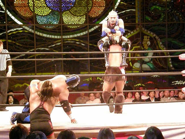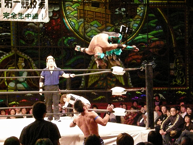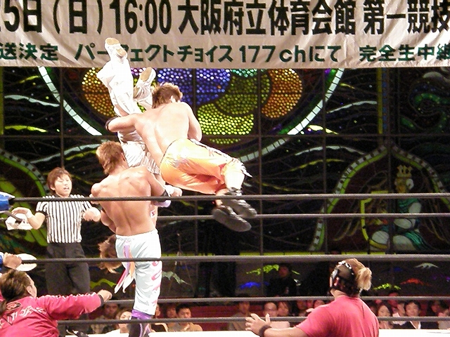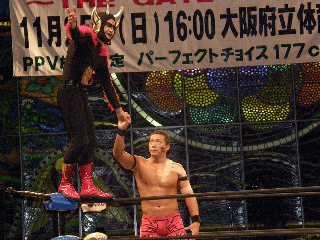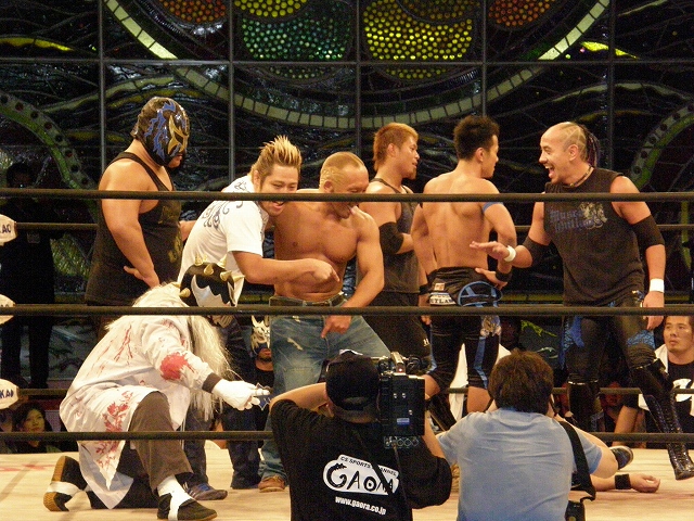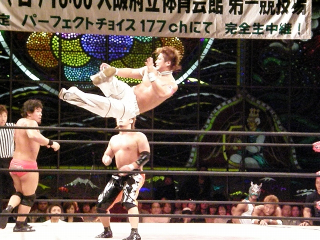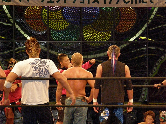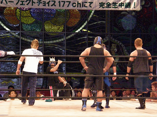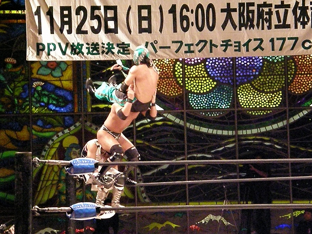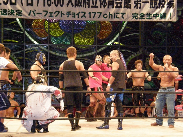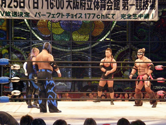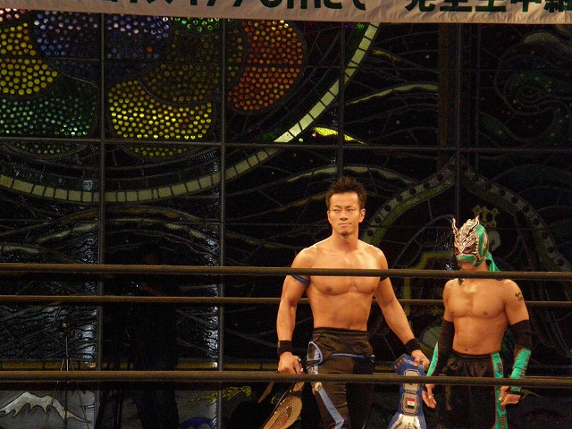 10.21 ドラゲー 京都大会 今日は当日券でドラゲー京都大会を観戦。 客の入りは8割がたってとこで、結構煽ってきたワリには満員になってないことが不思議。 座席は端っこの方でコーナーが邪魔で見にくかったんで、第1試合終了後に見やすい場所へ移動して立ち見。 第1試合 m.c.KZ.&ホルヘ・リベラ&ホーネット&超神龍対もっちー&フジイ&神田&クネス とりあえず初めて見るのはホーネット。 どうやらリベラ先生がつれてきたレスラーみたい。 でもこの試合に関しては、あまりいいところが見れなかった。 ダイビングボディプレスもあまり綺麗ではなかったし。 試合は、KZがベテラン組に長時間捕まる展開だったけど、超神龍のケブラーダや、リベラ先生のトペ・コンヒーロでNEX&メヒコ勢も反撃を見せる。 最後は超神龍がシューティングスタープレスで神田からピン。 第2試合 ストーカー市川対CIMA CIMAは左肩周辺にテーピング。 まだ万全の体調ではない様子。 "今日は怪我が治ってないオマエの為に、体に優しいスローモーションプロレスをしてやるよ。"(市) というわけで、スローモーションでロックアップをするも、CIMAが決めたヘッドロックであっけなくタップアウト。 下がろうとするCIMAを市っちゃんが呼び止め再試合。 市っちゃんはお約束のロープ渡りで、お客さんからダッシュを求められる。 そして手を掴まれてるCIMAがダッシュを見せて、市っちゃんは当然ロープで股間打ち。 その後、CIMAにマスクを取られた市っちゃんが雪崩式の腰振りフランケンを見せる。 技自体は当然CIMAに耐えられて自分のみ落下してしまったけど、この技はあの人の・・・。 終盤に市っちゃんは735をCIMAに決めるが、CIMAは首筋を押さえて倒れこむ。 市っちゃんもちょっと驚いたような顔をしてとまどってしまうが、CIMAは急遽起き上がりシュバインを決めてピン。 試合後はマイクもなく退場するCIMA。 ちょっと心配ではあったけど、メイン終了後には元気(?)な姿を見せてたんで大丈夫かな。 第3試合 マグニチュード岸和田&元気対サイバー・コング&信悟 サイコンも今度は広島で健介と試合するみたいやね。 しかし、三冠王者とシングルで試合が出来るってのはすごい。 健介に一泡吹かせることが出来れば十分と考えるか。 さて試合は仮想健介になってるのか、岸和田兄さんとサイコンで迫力のあるぶつかり合いからスタート。 その後、マッスル側は信悟の左ひざを集中的に攻める。 だが、信悟も兄さんのマンドリラーを耐えて、逆にブレーンバスターで投げ飛ばしサイコンにタッチ。 サイコンのラッシュからニューハザードがマッスルを追い込むも、岸和田兄さんのダイビングボディプレスや元気の逆さ押さえ込みで一進一退の攻防。 最後は、ロープに走った元気の後を追いかけてのスプラッシュを見せたサイコンが、サイバーボムで元気を沈めてピン。 セミファイナル 王子&キッド対土井&吉野 結果から書くと、ツインゲート王者の土井吉にタイフーン組が挑んだ試合やったけど、やっぱり土井吉の強さが光ってた試合。 試合自体は捕まってた王子が何とかキッドに交代して、キッドがデジャヴから場外へのバミューダトライアングルでお客さんを沸かせる。 王子も土井ちゃんをエレガントマジックで丸め込み、キッドもコーナーから2階建てのフランケンを決め吉野にウルウラを決めるも、これは土井ちゃんがカット。 マッスル側は土井ちゃんが王子をパワーボムの要領で担ぎ上げ、そこに吉野がトップコーナーから首に巻きついて落としていったりと連携技はさすがにスムーズ。 最後は通常のバカタレスライディングキック→トルベジーノ→吉野のイスアシスト付きでのバカタレスライディングキックで土井ちゃんが王子からピン。 メインイベント 斎了&享対YAMATO&ハルクの次期ツインゲート挑戦者決定戦 肉体改造した享の肉体を生で見るのは初めてではあるけど、CIMAに劣らないくらいのすごいいい体。 試合自体は序盤のタックル合戦のさなかに、YAMATOがデスバレーを決めたところで享がダウン。 そのため、しばらくは斎了のローンバトルが続く。 ハルクの張り手やYAMATOのテキサスクローバーホールドで攻め込まれるも、斎了も耐えてから享に交代。 その後は逆にハルクがリョウスカに捕まってしまう。 連携技でいえばハルヤマよりリョウスカが数倍上手。 あんまりハルヤマの方は連携技自体してなかったようやけど。。。 終盤はハルクがEVOを見せれば、YAMATOはギャラリアで享を沈めるが、リョウスカも斎了のドラゴンに享がジャンボの勝ち!で一歩も引かない。 しかし、タッグのコンビネーションでいえばリョウスカの方に軍配が上がるかな。 ダブルのプレミアムブリッジから、最後は斎了のプレミアムブリッジでYAMATOからピン。 メインイベント試合後 メイン終了後に乱入し、リョウスカに攻撃を加える土井吉に対して、Gammaが突如リングインしマッスルを蹴散らす。 この時点で満場のGammaコール。 そして、GammaとCIMAが握手しGammaのタイフ