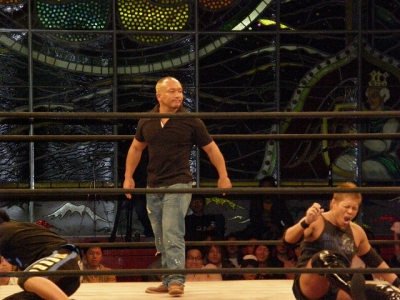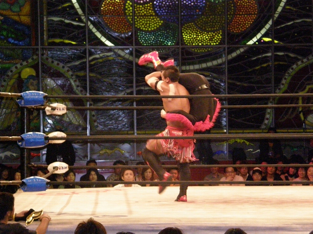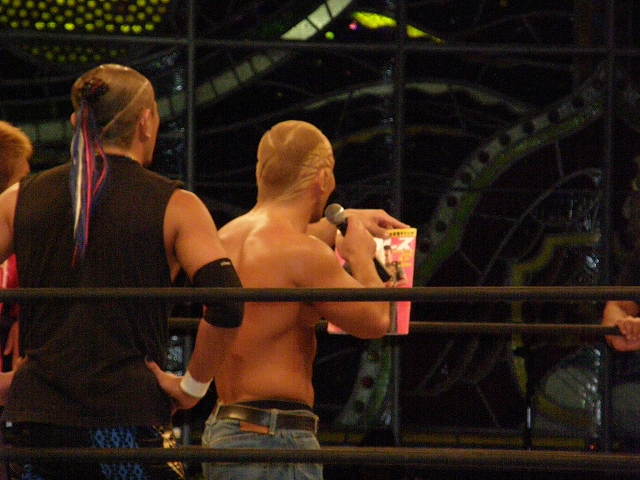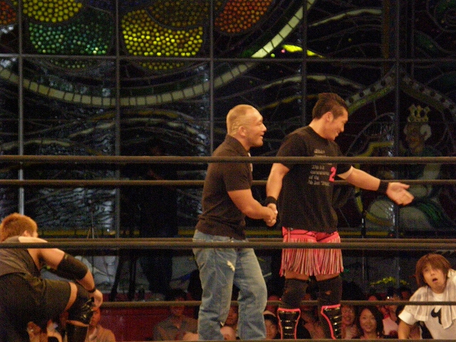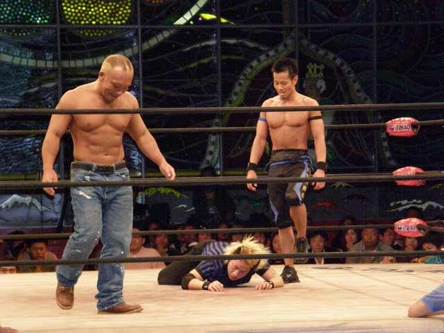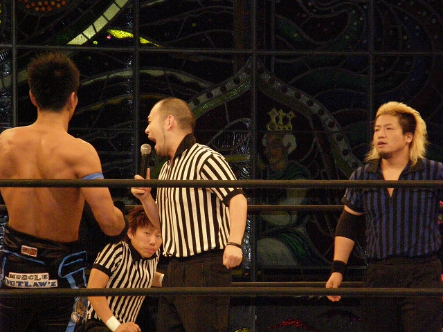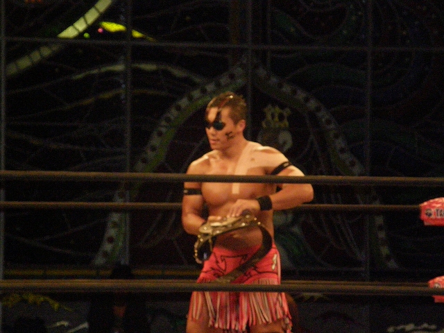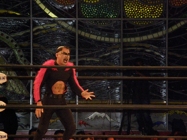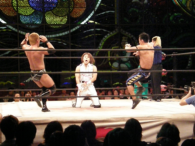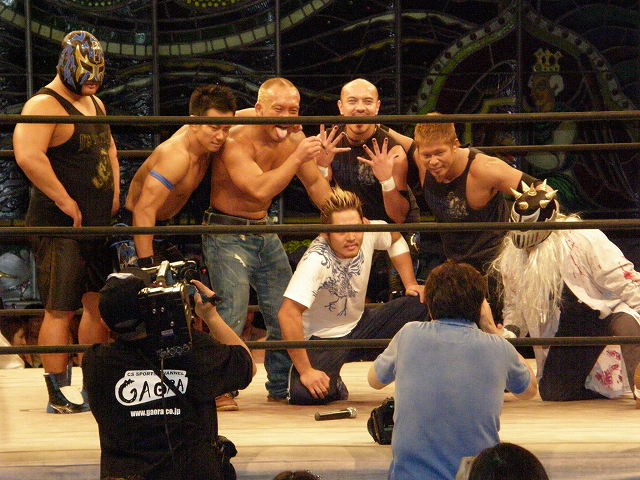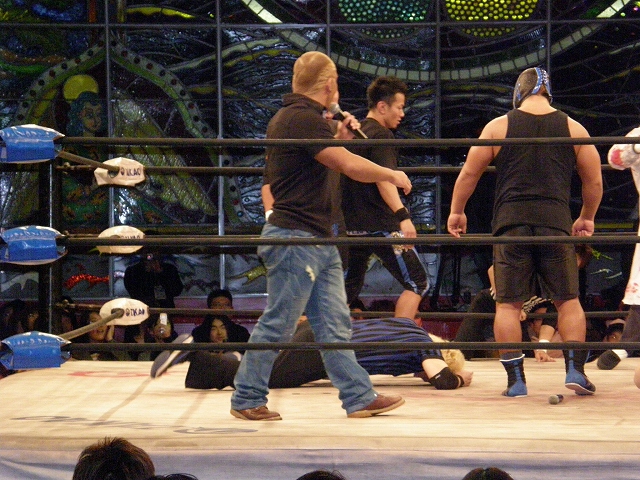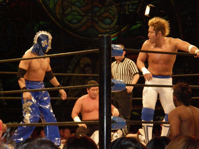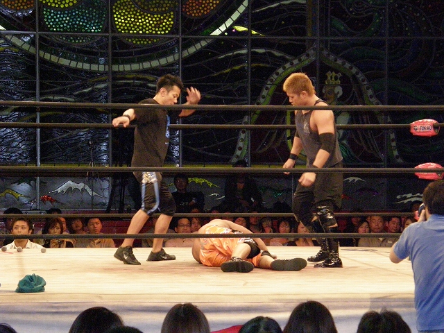 10.21 ドラゲー 京都大会 今日は当日券でドラゲー京都大会を観戦。 客の入りは8割がたってとこで、結構煽ってきたワリには満員になってないことが不思議。 座席は端っこの方でコーナーが邪魔で見にくかったんで、第1試合終了後に見やすい場所へ移動して立ち見。 第1試合 m.c.KZ.&ホルヘ・リベラ&ホーネット&超神龍対もっちー&フジイ&神田&クネス とりあえず初めて見るのはホーネット。 どうやらリベラ先生がつれてきたレスラーみたい。 でもこの試合に関しては、あまりいいところが見れなかった。 ダイビングボディプレスもあまり綺麗ではなかったし。 試合は、KZがベテラン組に長時間捕まる展開だったけど、超神龍のケブラーダや、リベラ先生のトペ・コンヒーロでNEX&メヒコ勢も反撃を見せる。 最後は超神龍がシューティングスタープレスで神田からピン。 第2試合 ストーカー市川対CIMA CIMAは左肩周辺にテーピング。 まだ万全の体調ではない様子。 "今日は怪我が治ってないオマエの為に、体に優しいスローモーションプロレスをしてやるよ。"(市) というわけで、スローモーションでロックアップをするも、CIMAが決めたヘッドロックであっけなくタップアウト。 下がろうとするCIMAを市っちゃんが呼び止め再試合。 市っちゃんはお約束のロープ渡りで、お客さんからダッシュを求められる。 そして手を掴まれてるCIMAがダッシュを見せて、市っちゃんは当然ロープで股間打ち。 その後、CIMAにマスクを取られた市っちゃんが雪崩式の腰振りフランケンを見せる。 技自体は当然CIMAに耐えられて自分のみ落下してしまったけど、この技はあの人の・・・。 終盤に市っちゃんは735をCIMAに決めるが、CIMAは首筋を押さえて倒れこむ。 市っちゃんもちょっと驚いたような顔をしてとまどってしまうが、CIMAは急遽起き上がりシュバインを決めてピン。 試合後はマイクもなく退場するCIMA。 ちょっと心配ではあったけど、メイン終了後には元気(?)な姿を見せてたんで大丈夫かな。 第3試合 マグニチュード岸和田&元気対サイバー・コング&信悟 サイコンも今度は広島で健介と試合するみたいやね。 しかし、三冠王者とシングルで試合が出来るってのはすごい。 健介に一泡吹かせることが出来れば十分と考えるか。 さて試合は仮想健介になってるのか、岸和田兄さんとサイコンで迫力のあるぶつかり合いからスタート。 その後、マッスル側は信悟の左ひざを集中的に攻める。 だが、信悟も兄さんのマンドリラーを耐えて、逆にブレーンバスターで投げ飛ばしサイコンにタッチ。 サイコンのラッシュからニューハザードがマッスルを追い込むも、岸和田兄さんのダイビングボディプレスや元気の逆さ押さえ込みで一進一退の攻防。 最後は、ロープに走った元気の後を追いかけてのスプラッシュを見せたサイコンが、サイバーボムで元気を沈めてピン。 セミファイナル 王子&キッド対土井&吉野 結果から書くと、ツインゲート王者の土井吉にタイフーン組が挑んだ試合やったけど、やっぱり土井吉の強さが光ってた試合。 試合自体は捕まってた王子が何とかキッドに交代して、キッドがデジャヴから場外へのバミューダトライアングルでお客さんを沸かせる。 王子も土井ちゃんをエレガントマジックで丸め込み、キッドもコーナーから2階建てのフランケンを決め吉野にウルウラを決めるも、これは土井ちゃんがカット。 マッスル側は土井ちゃんが王子をパワーボムの要領で担ぎ上げ、そこに吉野がトップコーナーから首に巻きついて落としていったりと連携技はさすがにスムーズ。 最後は通常のバカタレスライディングキック→トルベジーノ→吉野のイスアシスト付きでのバカタレスライディングキックで土井ちゃんが王子からピン。 メインイベント 斎了&享対YAMATO&ハルクの次期ツインゲート挑戦者決定戦 肉体改造した享の肉体を生で見るのは初めてではあるけど、CIMAに劣らないくらいのすごいいい体。 試合自体は序盤のタックル合戦のさなかに、YAMATOがデスバレーを決めたところで享がダウン。 そのため、しばらくは斎了のローンバトルが続く。 ハルクの張り手やYAMATOのテキサスクローバーホールドで攻め込まれるも、斎了も耐えてから享に交代。 その後は逆にハルクがリョウスカに捕まってしまう。 連携技でいえばハルヤマよりリョウスカが数倍上手。 あんまりハルヤマの方は連携技自体してなかったようやけど。。。 終盤はハルクがEVOを見せれば、YAMATOはギャラリアで享を沈めるが、リョウスカも斎了のドラゴンに享がジャンボの勝ち!で一歩も引かない。 しかし、タッグのコンビネーションでいえばリョウスカの方に軍配が上がるかな。 ダブルのプレミアムブリッジから、最後は斎了のプレミアムブリッジでYAMATOからピン。 メインイベント試合後 メイン終了後に乱入し、リョウスカに攻撃を加える土井吉に対して、Gammaが突如リングインしマッスルを蹴散らす。 この時点で満場のGammaコール。 そして、GammaとCIMAが握手しGammaのタイフ