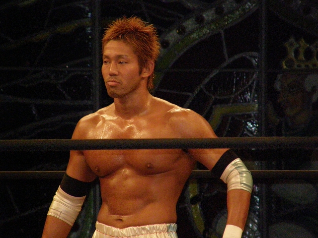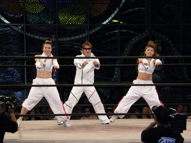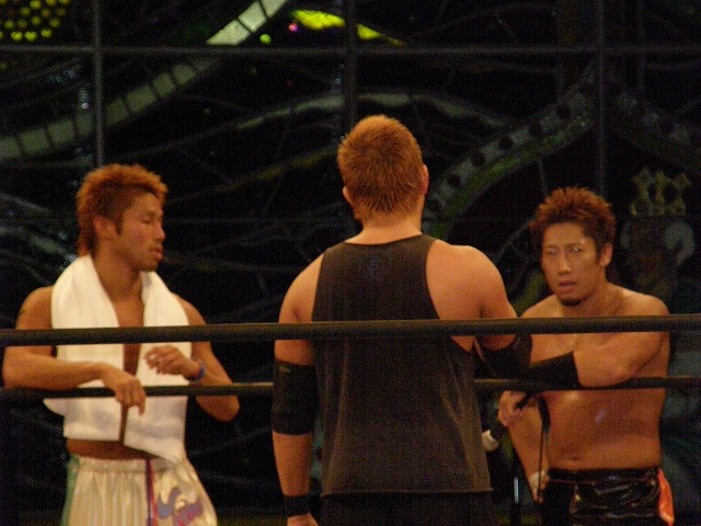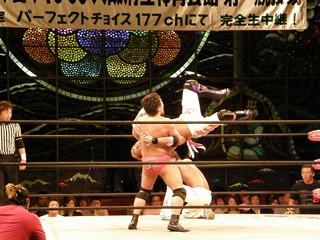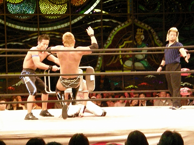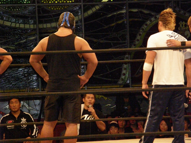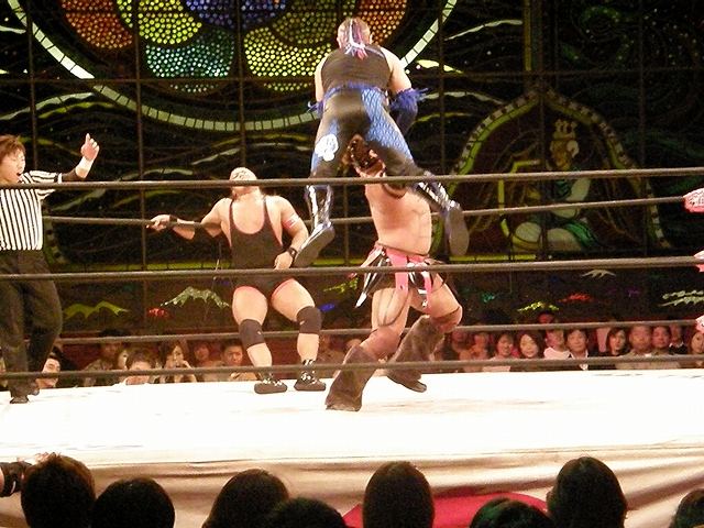 10.21 ドラゲー 京都大会 今日は当日券でドラゲー京都大会を観戦。 客の入りは8割がたってとこで、結構煽ってきたワリには満員になってないことが不思議。 座席は端っこの方でコーナーが邪魔で見にくかったんで、第1試合終了後に見やすい場所へ移動して立ち見。 第1試合 m.c.KZ.&ホルヘ・リベラ&ホーネット&超神龍対もっちー&フジイ&神田&クネス とりあえず初めて見るのはホーネット。 どうやらリベラ先生がつれてきたレスラーみたい。 でもこの試合に関しては、あまりいいところが見れなかった。 ダイビングボディプレスもあまり綺麗ではなかったし。 試合は、KZがベテラン組に長時間捕まる展開だったけど、超神龍のケブラーダや、リベラ先生のトペ・コンヒーロでNEX&メヒコ勢も反撃を見せる。 最後は超神龍がシューティングスタープレスで神田からピン。 第2試合 ストーカー市川対CIMA CIMAは左肩周辺にテーピング。 まだ万全の体調ではない様子。 "今日は怪我が治ってないオマエの為に、体に優しいスローモーションプロレスをしてやるよ。"(市) というわけで、スローモーションでロックアップをするも、CIMAが決めたヘッドロックであっけなくタップアウト。 下がろうとするCIMAを市っちゃんが呼び止め再試合。 市っちゃんはお約束のロープ渡りで、お客さんからダッシュを求められる。 そして手を掴まれてるCIMAがダッシュを見せて、市っちゃんは当然ロープで股間打ち。 その後、CIMAにマスクを取られた市っちゃんが雪崩式の腰振りフランケンを見せる。 技自体は当然CIMAに耐えられて自分のみ落下してしまったけど、この技はあの人の・・・。 終盤に市っちゃんは735をCIMAに決めるが、CIMAは首筋を押さえて倒れこむ。 市っちゃんもちょっと驚いたような顔をしてとまどってしまうが、CIMAは急遽起き上がりシュバインを決めてピン。 試合後はマイクもなく退場するCIMA。 ちょっと心配ではあったけど、メイン終了後には元気(?)な姿を見せてたんで大丈夫かな。 第3試合 マグニチュード岸和田&元気対サイバー・コング&信悟 サイコンも今度は広島で健介と試合するみたいやね。 しかし、三冠王者とシングルで試合が出来るってのはすごい。 健介に一泡吹かせることが出来れば十分と考えるか。 さて試合は仮想健介になってるのか、岸和田兄さんとサイコンで迫力のあるぶつかり合いからスタート。 その後、マッスル側は信悟の左ひざを集中的に攻める。 だが、信悟も兄さんのマンドリラーを耐えて、逆にブレーンバスターで投げ飛ばしサイコンにタッチ。 サイコンのラッシュからニューハザードがマッスルを追い込むも、岸和田兄さんのダイビングボディプレスや元気の逆さ押さえ込みで一進一退の攻防。 最後は、ロープに走った元気の後を追いかけてのスプラッシュを見せたサイコンが、サイバーボムで元気を沈めてピン。 セミファイナル 王子&キッド対土井&吉野 結果から書くと、ツインゲート王者の土井吉にタイフーン組が挑んだ試合やったけど、やっぱり土井吉の強さが光ってた試合。 試合自体は捕まってた王子が何とかキッドに交代して、キッドがデジャヴから場外へのバミューダトライアングルでお客さんを沸かせる。 王子も土井ちゃんをエレガントマジックで丸め込み、キッドもコーナーから2階建てのフランケンを決め吉野にウルウラを決めるも、これは土井ちゃんがカット。 マッスル側は土井ちゃんが王子をパワーボムの要領で担ぎ上げ、そこに吉野がトップコーナーから首に巻きついて落としていったりと連携技はさすがにスムーズ。 最後は通常のバカタレスライディングキック→トルベジーノ→吉野のイスアシスト付きでのバカタレスライディングキックで土井ちゃんが王子からピン。 メインイベント 斎了&享対YAMATO&ハルクの次期ツインゲート挑戦者決定戦 肉体改造した享の肉体を生で見るのは初めてではあるけど、CIMAに劣らないくらいのすごいいい体。 試合自体は序盤のタックル合戦のさなかに、YAMATOがデスバレーを決めたところで享がダウン。 そのため、しばらくは斎了のローンバトルが続く。 ハルクの張り手やYAMATOのテキサスクローバーホールドで攻め込まれるも、斎了も耐えてから享に交代。 その後は逆にハルクがリョウスカに捕まってしまう。 連携技でいえばハルヤマよりリョウスカが数倍上手。 あんまりハルヤマの方は連携技自体してなかったようやけど。。。 終盤はハルクがEVOを見せれば、YAMATOはギャラリアで享を沈めるが、リョウスカも斎了のドラゴンに享がジャンボの勝ち!で一歩も引かない。 しかし、タッグのコンビネーションでいえばリョウスカの方に軍配が上がるかな。 ダブルのプレミアムブリッジから、最後は斎了のプレミアムブリッジでYAMATOからピン。 メインイベント試合後 メイン終了後に乱入し、リョウスカに攻撃を加える土井吉に対して、Gammaが突如リングインしマッスルを蹴散らす。 この時点で満場のGammaコール。 そして、GammaとCIMAが握手しGammaのタイフ