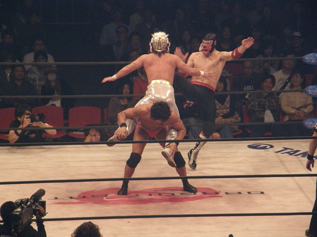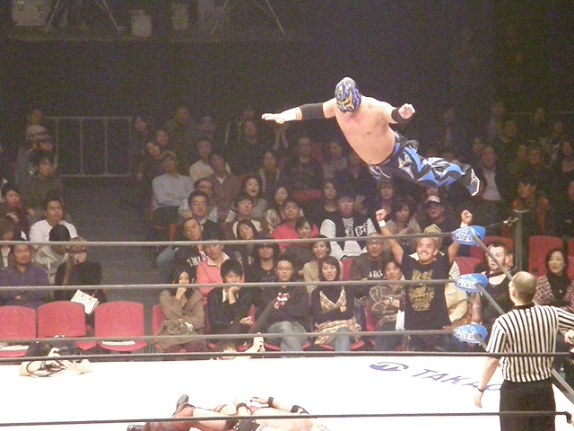さて試合はその後、キッドがエプロンサイドの健想に対してミサイルキックで場外に落としてから、場外へ向けてスワンダイブ式のウラカン・ラナ。