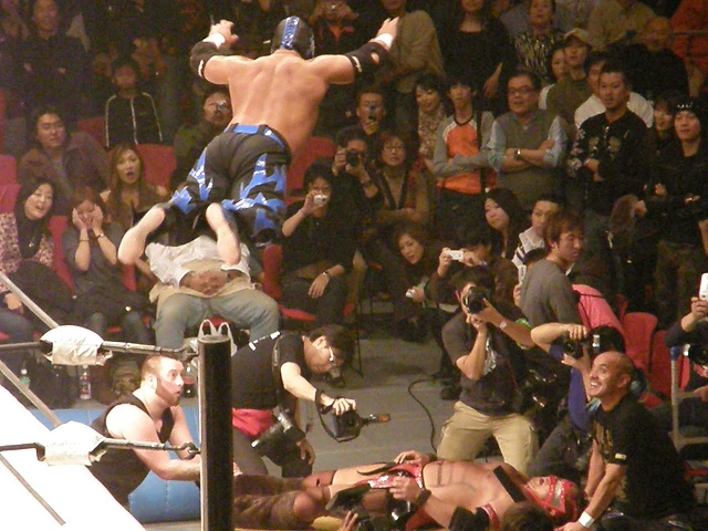 圧巻はコーナーへ後ろ向きに登ったジェネリコに対して、ジャンプでコーナートップまで上がり、そこからのリバースフランケンシュタイナー。