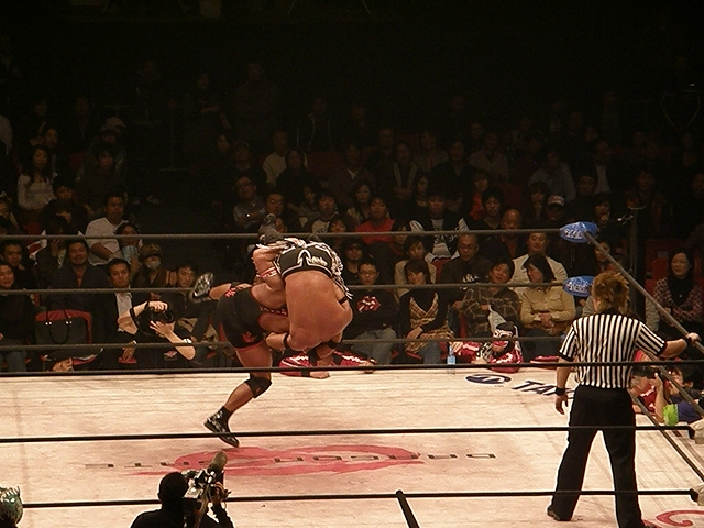 序盤はお互いにらみ合いからのショルダータックル合戦で、結果勝ったのはサイコン。