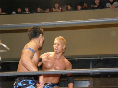 2008年ドラゲー初め~1.13 SITE-KOBE・PRIMAL GATE~ 今日は2008年最初のプロレス生観戦。 いつもとは違い今日は15時から試合開始なので、昼過ぎにリングソウルで2月開催のエルドラド@デルアリと、1月26日の全日本プロレスファン感謝デーのチケットを買って、SITE-KOBEへ。 着いてみると、相変わらずの人の多さ。 チケットは80番台だったのに、既にリングサイド2列目くらいまでは埋まってしまってるし。 というわけで、今日はマトモな写真はないですね。 全体を撮ろうと思うと、どうしても前の人の頭が写ってしまうんで 第1試合 CIMA&キッド&享&王子対アラケン&岩佐&戸澤&カツオ 今日が復帰戦となった岩佐。 試合を通して見てみても、8人タッグだったってのもあるかもしれないけど、そんなにブランクは感じさせない動き。 試合でもキッドと享を逆エビ固めとキャメルクラッチの体勢に決めておいて、そこへアラケンがドロップキックを見舞っていったりと連携技も増えてる。 これなら、新岩タッグで再度ツインゲートを狙っていけそう。 それ以外で目立ってたのは、カツオとCIMAのやりあい。 特にCIMAはいつもにまして厳しい攻めを、トザカツに向けて決めていく。 厳しいというのは身体的な攻めは当然のこと、今日のCIMAは口でも厳しい攻撃をしてたね。 最後はCIMAがリバースのWARスペシャルのような変形羽根折り固めでカツオがタップ。 試合後のCIMA "まずは岩佐、復帰おめでとう。岩佐の復帰は戸澤塾にとっても、ドラゴンゲートにとっても大きいよ。"(CIMA) "でも次に試合するときは、タイフーン全員でオマエの腕狙っていくから。"(CIMA) "ただ今日の試合は戸澤塾対タイフーンの全面対抗戦ちゃうぞ、タイフーン対新岩その他じゃ。"(CIMA) その後カツオも突っかかっていくが、CIMAはスカす。 そしてタイフーンが去った後に、復帰戦だった岩佐からのマイクでも、戸澤とカツオに対してもう少し頑張れと叱咤激励。 そして戸澤が一言。 "これからも頑張って・・・太っていきます!"(戸澤) "え~~~~!"(客) "それしかねぇだろ!"(戸澤) 素晴らしい逆ギレっぷり。 これだけ開き直られると、逆に清々しく思えてくる。(笑) 今日のCIMAは何かあったのか、トザカツに対して試合を通して厳しい態度。 第2試合 もっちー対ジャクソン対ストーカー市川 試合は途中にもっちーの蹴りでジャクソンの杖が壊れてしまうが、それはそれで楽しい時間を作る3人のレスラー+レフェリー1人。 最後はもっちーが壊れた杖の一部で玉金の頭を小突いて、もっちーの反則負け。 もっちーはなぜかこの試合で手のひらから出血してたんだな。 ※もっちーが自身のブログでこのことについて書いてます。 第3試合 YAMATO&信悟対ルパン&m.c.KZ. 試合は終始ニューハザード組が3枚くらい上手の試合運びで、終わってみれば余裕の試合。 特にこの試合で大きく見えたのは信悟ではなくYAMATO。 元々、ルパンやKZと同じNEX勢だったのに、今日の試合を見てる限り、現段階ではルパンとKZとの差はまだ大きいようにも感じたし。 普段は信悟やハルクと一緒にいるから目立ってないけど、体も確実にビルドアップされていってるし、試合の中で誤爆してしまったけど信悟に対して決めたスピアーは迫力もあった。 試合中に所々天然を思わせる面を多く覗かせるけど、それはそれで面白いからいいとしよう。(笑) 最後はYAMATOがギャラリアでKZからピン。 試合終了後にKZが悔しそうにリングを叩き付けたのも少し印象的。 第4試合 神田&吉野&Dr.マッスル対土井&Gamma&元気 ヒール同士の対戦といえば、闘龍門時代に悪冠一色の大鷲対ドッティ修司を思い出すけど、結局その時は両者によるレフェリー暴行になってしまったんで、この試合もドッチラケで終わってしまうのかと思ってたけど、普通に何の文句も言わずに試合をしてたな。 試合の序盤に、神田と元気・ドクターとGammaの攻防が終わった後、待望の土井と吉野が出てくるとお客さんの歓声もスゴイ。 しかしその歓声をかき消したのはGamma。 いきなり背後から吉野を襲い、何と吉野に唾液攻撃を見舞う。 しかし吉野も体勢を入れ替えると、Gammaに対してうがい攻撃。 その後は普通に両チームとも激しい攻防を見せ、途中に吉野が土井ちゃんに向けてタッチしようとするシーンもありながら、最後はパウダー攻撃(どちらのチームがしかけたのかは不明。)から元気がバックスライド・フロムヘルでドクターからピン。 試合後も特に何のマイクもなく去っていく両チーム。 マッスルアウトローズ同士の試合ということで、試合自体は面白かったんだから、できれば試合前か試合後にマイクも欲しかったところ。 第5試合 サイバーコング&サイバー・リョウ対BBハルク&BBフジイ Xは前回の予想通り、斎了とフジイさん。 両チームのセコンドには信悟とYAMATO。 試合ではサイバー組は連携を見せるけど、BB組は特に連携技はなし。 途中にサイコンがハルクに対してリフトアップスラムを見せると、サイリョウが"オレも、オレも!"ってタッチを要求して、結局出来な