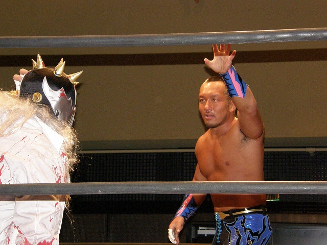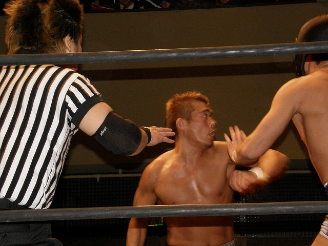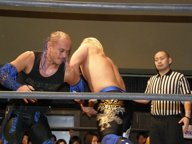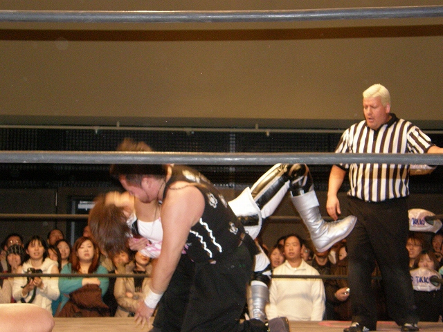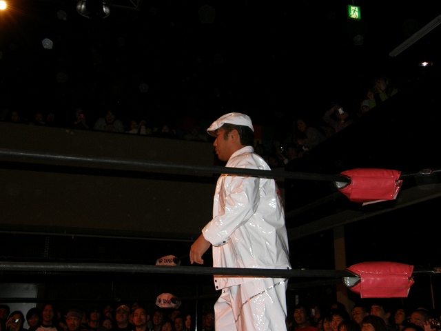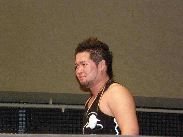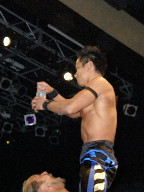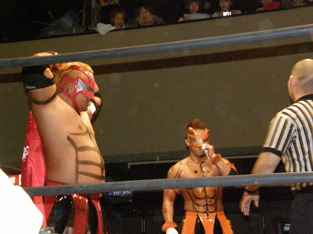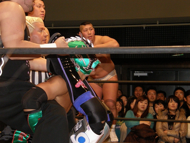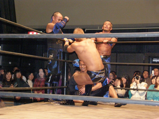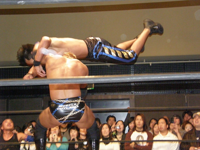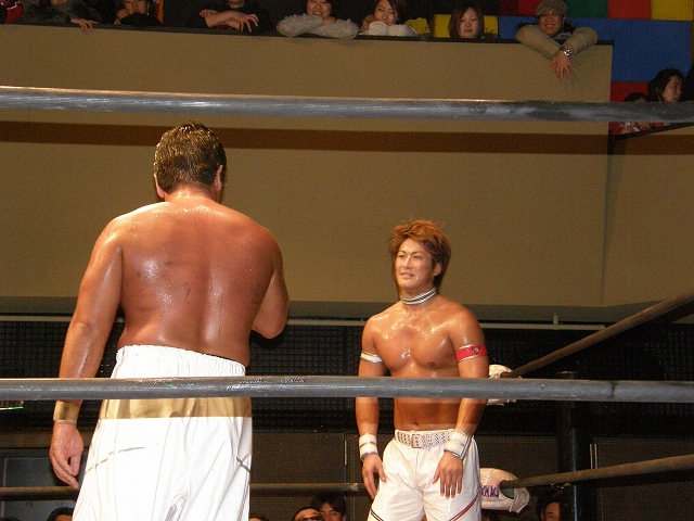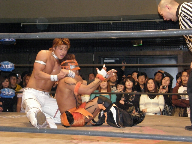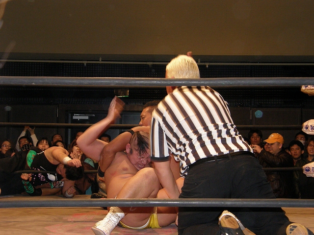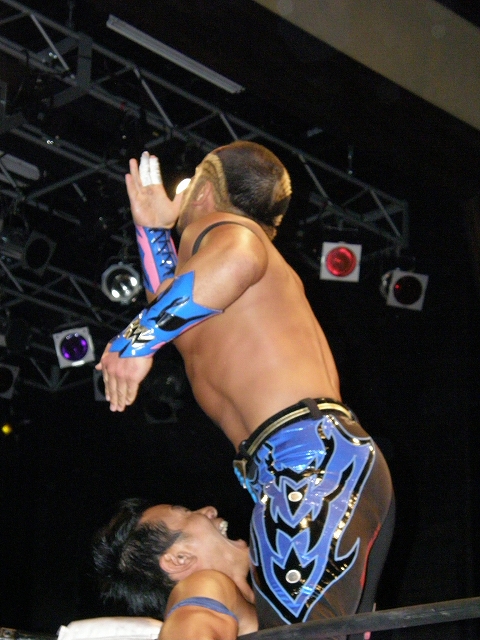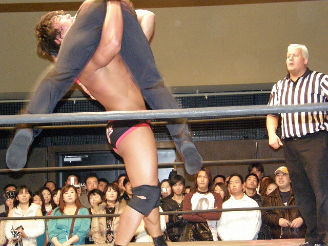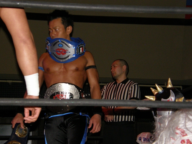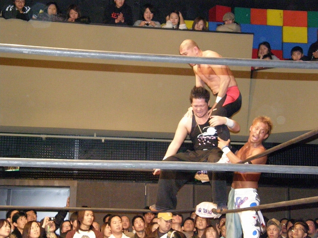 2008年ドラゲー初め~1.13 SITE-KOBE・PRIMAL GATE~ 今日は2008年最初のプロレス生観戦。 いつもとは違い今日は15時から試合開始なので、昼過ぎにリングソウルで2月開催のエルドラド@デルアリと、1月26日の全日本プロレスファン感謝デーのチケットを買って、SITE-KOBEへ。 着いてみると、相変わらずの人の多さ。 チケットは80番台だったのに、既にリングサイド2列目くらいまでは埋まってしまってるし。 というわけで、今日はマトモな写真はないですね。 全体を撮ろうと思うと、どうしても前の人の頭が写ってしまうんで 第1試合 CIMA&キッド&享&王子対アラケン&岩佐&戸澤&カツオ 今日が復帰戦となった岩佐。 試合を通して見てみても、8人タッグだったってのもあるかもしれないけど、そんなにブランクは感じさせない動き。 試合でもキッドと享を逆エビ固めとキャメルクラッチの体勢に決めておいて、そこへアラケンがドロップキックを見舞っていったりと連携技も増えてる。 これなら、新岩タッグで再度ツインゲートを狙っていけそう。 それ以外で目立ってたのは、カツオとCIMAのやりあい。 特にCIMAはいつもにまして厳しい攻めを、トザカツに向けて決めていく。 厳しいというのは身体的な攻めは当然のこと、今日のCIMAは口でも厳しい攻撃をしてたね。 最後はCIMAがリバースのWARスペシャルのような変形羽根折り固めでカツオがタップ。 試合後のCIMA "まずは岩佐、復帰おめでとう。岩佐の復帰は戸澤塾にとっても、ドラゴンゲートにとっても大きいよ。"(CIMA) "でも次に試合するときは、タイフーン全員でオマエの腕狙っていくから。"(CIMA) "ただ今日の試合は戸澤塾対タイフーンの全面対抗戦ちゃうぞ、タイフーン対新岩その他じゃ。"(CIMA) その後カツオも突っかかっていくが、CIMAはスカす。 そしてタイフーンが去った後に、復帰戦だった岩佐からのマイクでも、戸澤とカツオに対してもう少し頑張れと叱咤激励。 そして戸澤が一言。 "これからも頑張って・・・太っていきます!"(戸澤) "え~~~~!"(客) "それしかねぇだろ!"(戸澤) 素晴らしい逆ギレっぷり。 これだけ開き直られると、逆に清々しく思えてくる。(笑) 今日のCIMAは何かあったのか、トザカツに対して試合を通して厳しい態度。 第2試合 もっちー対ジャクソン対ストーカー市川 試合は途中にもっちーの蹴りでジャクソンの杖が壊れてしまうが、それはそれで楽しい時間を作る3人のレスラー+レフェリー1人。 最後はもっちーが壊れた杖の一部で玉金の頭を小突いて、もっちーの反則負け。 もっちーはなぜかこの試合で手のひらから出血してたんだな。 ※もっちーが自身のブログでこのことについて書いてます。 第3試合 YAMATO&信悟対ルパン&m.c.KZ. 試合は終始ニューハザード組が3枚くらい上手の試合運びで、終わってみれば余裕の試合。 特にこの試合で大きく見えたのは信悟ではなくYAMATO。 元々、ルパンやKZと同じNEX勢だったのに、今日の試合を見てる限り、現段階ではルパンとKZとの差はまだ大きいようにも感じたし。 普段は信悟やハルクと一緒にいるから目立ってないけど、体も確実にビルドアップされていってるし、試合の中で誤爆してしまったけど信悟に対して決めたスピアーは迫力もあった。 試合中に所々天然を思わせる面を多く覗かせるけど、それはそれで面白いからいいとしよう。(笑) 最後はYAMATOがギャラリアでKZからピン。 試合終了後にKZが悔しそうにリングを叩き付けたのも少し印象的。 第4試合 神田&吉野&Dr.マッスル対土井&Gamma&元気 ヒール同士の対戦といえば、闘龍門時代に悪冠一色の大鷲対ドッティ修司を思い出すけど、結局その時は両者によるレフェリー暴行になってしまったんで、この試合もドッチラケで終わってしまうのかと思ってたけど、普通に何の文句も言わずに試合をしてたな。 試合の序盤に、神田と元気・ドクターとGammaの攻防が終わった後、待望の土井と吉野が出てくるとお客さんの歓声もスゴイ。 しかしその歓声をかき消したのはGamma。 いきなり背後から吉野を襲い、何と吉野に唾液攻撃を見舞う。 しかし吉野も体勢を入れ替えると、Gammaに対してうがい攻撃。 その後は普通に両チームとも激しい攻防を見せ、途中に吉野が土井ちゃんに向けてタッチしようとするシーンもありながら、最後はパウダー攻撃(どちらのチームがしかけたのかは不明。)から元気がバックスライド・フロムヘルでドクターからピン。 試合後も特に何のマイクもなく去っていく両チーム。 マッスルアウトローズ同士の試合ということで、試合自体は面白かったんだから、できれば試合前か試合後にマイクも欲しかったところ。 第5試合 サイバーコング&サイバー・リョウ対BBハルク&BBフジイ Xは前回の予想通り、斎了とフジイさん。 両チームのセコンドには信悟とYAMATO。 試合ではサイバー組は連携を見せるけど、BB組は特に連携技はなし。 途中にサイコンがハルクに対してリフトアップスラムを見せると、サイリョウが"オレも、オレも!"ってタッチを要求して、結局出来な