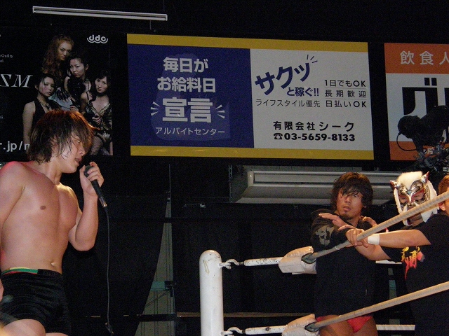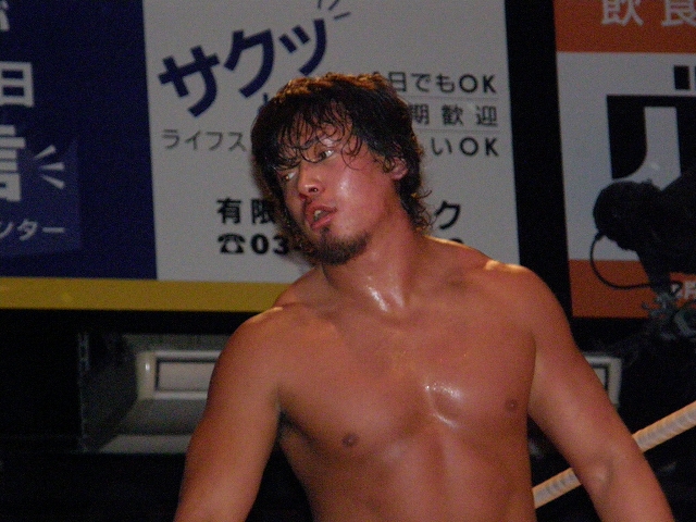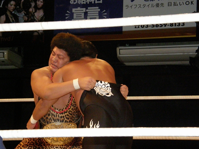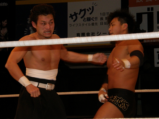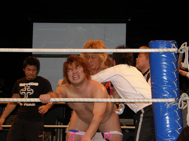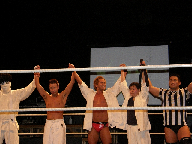 それ以外では、メインのもっちー&TAKA&三四郎対信悟&ハルク&柿本なんかは、序盤の笑いあり、終盤の技の攻防ありとメインにふさわしい内容。