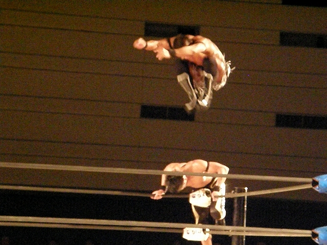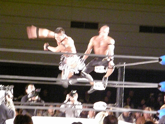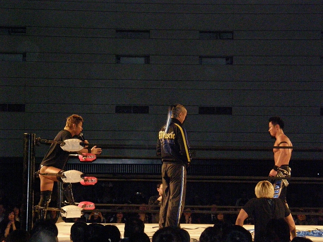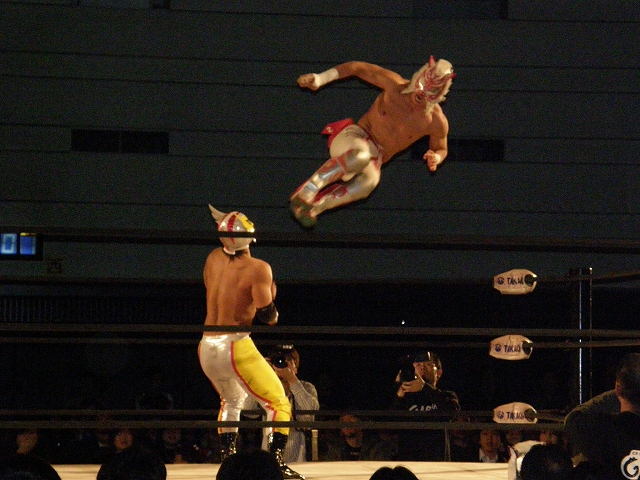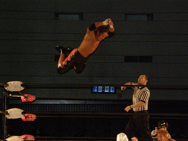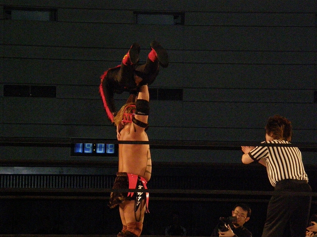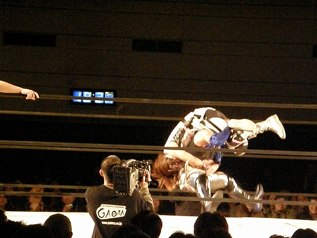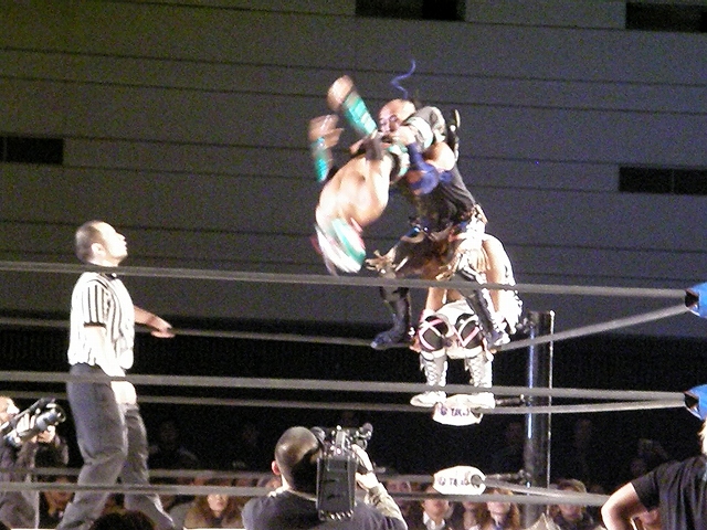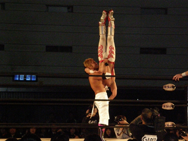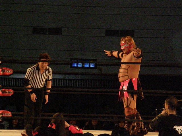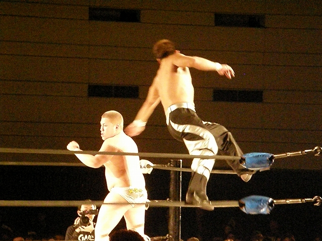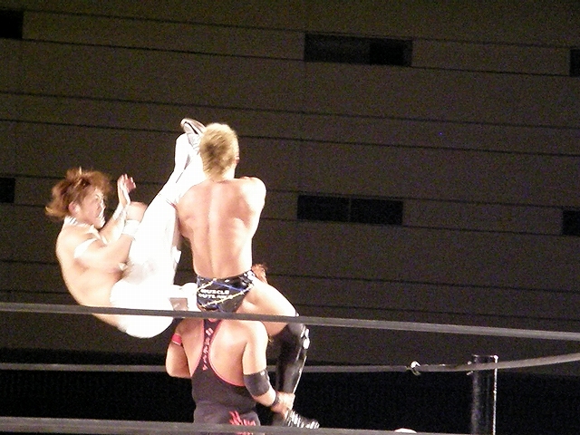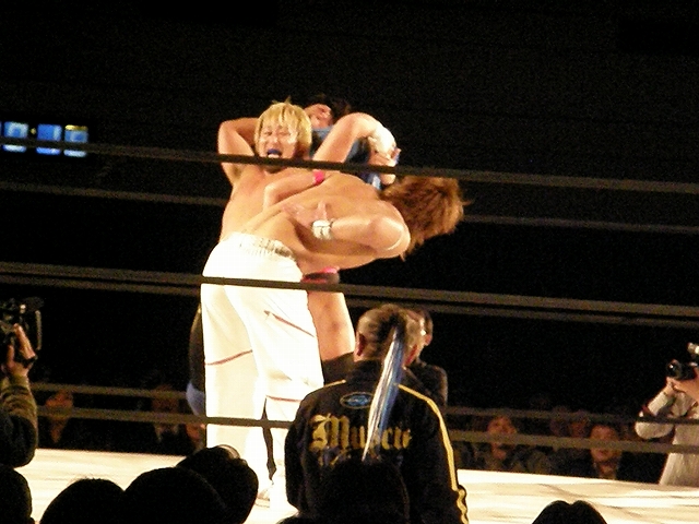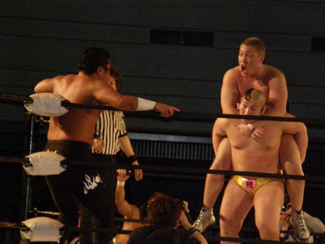 ブレイブはドリームより強し~3.1 大阪大会~ 待望のドラゲー大阪大会。 メインイベントの吉野対CIMA効果なのか、いつも以上のお客さんの多さ。 というわけで文句のつけようがないくらいの超満員札止めでの大阪大会スタート。 試合開始前には、タイフーンとマッスルアウトローズ総出でのブレイブゲート公開調印式。 最初にCIMA、そして次に吉野が署名を終了してから、それぞれ一言意気込みを語る。 "今日の試合では、オレが勝っていつまでもオマエの時代じゃないってことを証明したるからな。"(吉野) "ブレイブゲートはオレが巻いてこそ最高峰になるんじゃ。"(CIMA) そこへ割り込んできたのは神田。 "吉野、試合なんかなぁ、凶器でも乱入でもしてチャッチャと勝てばいいんじゃ、コラ!"(神田) 吉野がそれをたしなめると、続いて斎了が "オイ、神田!オマエ、マイク持っておきながら噛んでんじゃねぇぞ。"(斎了) お客さんもこれには納得だったんだけど、その直後のマイクで見事に噛んでしまう斎了w その後斎了がマッスルの乱入に対して警告すると、 "今日はとにかく試合を壊すようなことだけはせんといてくれ。"(CIMA) それにちょっとイラっとした様子の斎了。 "CIMAもぽろっと負けないように気をつけるんだな。"(斎了) "オレが負けるわけないやないか。試合前にそんなん言わんでいいんじゃ、コラ。"(CIMA) 色んな爆弾が点火された状態で、調印式は終了。 いつもCIMAに突っかかるGammaは何もしゃべらず、行動も起こさず。 逆に静かな分だけ、企んでんじゃないかと思ってしまう。 今日は何もなかったけど、「逆転満塁ホームラン」って何やろね。 第1試合 享&斎了&超神龍対アラケン&シーサー&BOY 調印式では少し怒った顔を見せた斎了だけど、この試合が始まると楽しい斎了に戻ってた。 やっぱり斎了にヒールは似合わないような気がすんねんけど、ちょっと見てみたい気もする。 Doの頃はヒールといっても、悪冠やマッスルみたいなタイプのヒールではなかったもんな。 試合の方では、中盤にぶつかった享とシーサーの技の切り返し合いは思わず見とれてしまう程に良かった。 派手さは欠けるかもしれないけど、テクニックで見せてくれる試合巧者の2人のやりとりで第1試合から興行全体が引き締まる感じ。 試合終盤にはシーサーとBOYで超神龍にダブルのジャックナイフ固めを決めるが、これは斎了がカット。 ただ試合を通してみると、タイフーンのリョウスカが横綱相撲を見せたかな。 最後はリョウスカの幻壊(だっけ?)でBOYから享が3カウントを奪って勝利。 第2試合 ストーカー市川対サイコン マッチメイカーはいっちゃんが死んでもいいと思ったんだろうか、と感じたカード。 マッスル以外では、いっちゃんが一番相手にしてはいけないレスラーだと思うねんけどね。 そのいっちゃんは入場時にはサイコンのマネをして、パイナップルを持参するが当然割れず。 試合はサイコンと組み合うのを嫌がり、なぜか玉金とロックアップをしていく。 まあ、結局はサイコンに捕まり軽々とリフトアップされるが、玉金にお願いされてサイコンもいっちゃんを放り投げることなく、そろっとリングに降ろすなど先輩に対して気遣いを見せる。 しかし、ショルダータックル合戦では吹っ飛ばされ、プランチャを仕掛けては受け止められ、あげくの果てにはセカンドロープからのFuck Youエルボーを喰らってしまうが、何とカウント2で返すいっちゃん。 その後トップロープからのエルボーをかわすと、カンチョーから735、そしてラ・マヒストラルを狙うがサイコンが重過ぎて決めることが出来ない。 終盤パイナップルを凶器に使って勝機を見出そうとするが、サイコンは走りこんできたいっちゃんにカウンターのパイナップルボンバーを決めてピン。 この試合は、ここ数ヶ月のいっちゃんの試合の中でもベストバウトなんじゃないすか? 体も張ってたし、時間も長かったし、何よりお客さんも盛り上がってた。 第3試合 元気&岸和田兄さん対王子&キッド 試合はタイフーン組が入場した直後に、マッスル組プラス神田がダッシュで奇襲を仕掛けてくる。 元気は王子を、兄さんはキッドを捕えて場外戦へ。 この試合は王子のやられてるシーンが全体の7割~8割くらい。 その分、今日はキッドの印象が薄い。 王子に肩車をさせての雪崩式フランケンシュタイナーやバミューダトライアングルくらいかな。 まあ、試合自体が常にマッスルペースで進んでたし、それに元気と兄さんのコンビというのは中々相性がよさげ。 パワーで攻める兄さんと、要所要所でいい繋ぎを見せる元気は中々相手にペースを渡さない。 王子も兄さんのラストライドを丸め込んだりと粘るが、最後は兄さんの垂直落下式ブレーンバスターからのビーチブレイクで王子から元気がピン。 試合後に、元気は王子のコスチュームを奪い取ると、王子に向かって"これはオレが預かっとくぞ。"と強奪。 ボンタンを奪った次は王子のコスですか。 となると、次はコスチュームコントラ