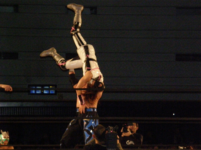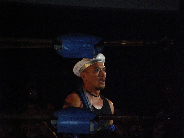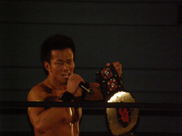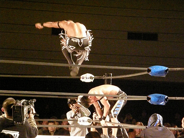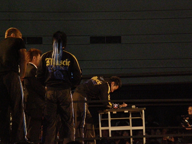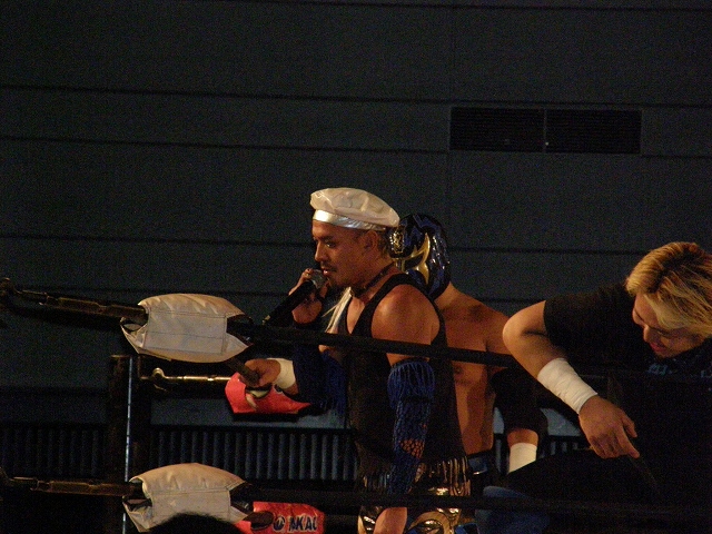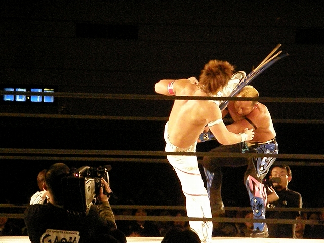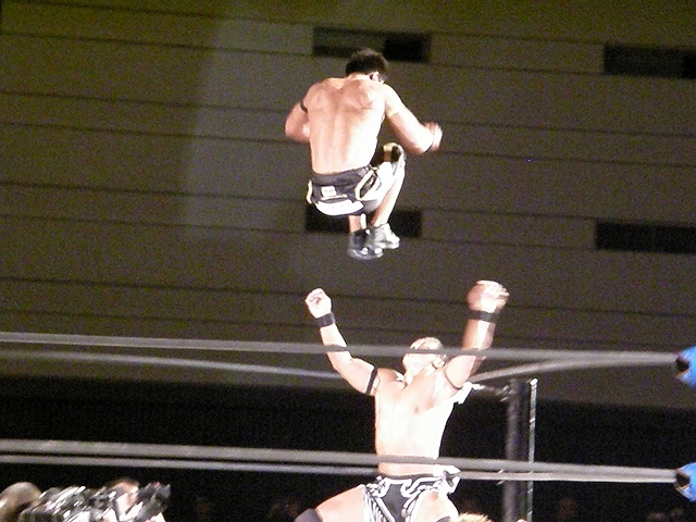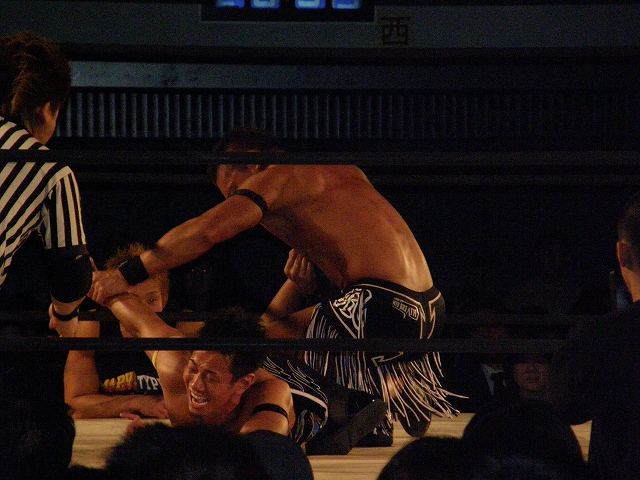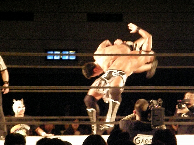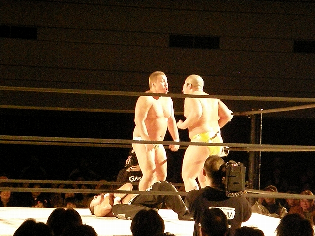 ブレイブはドリームより強し~3.1 大阪大会~ 待望のドラゲー大阪大会。 メインイベントの吉野対CIMA効果なのか、いつも以上のお客さんの多さ。 というわけで文句のつけようがないくらいの超満員札止めでの大阪大会スタート。 試合開始前には、タイフーンとマッスルアウトローズ総出でのブレイブゲート公開調印式。 最初にCIMA、そして次に吉野が署名を終了してから、それぞれ一言意気込みを語る。 "今日の試合では、オレが勝っていつまでもオマエの時代じゃないってことを証明したるからな。"(吉野) "ブレイブゲートはオレが巻いてこそ最高峰になるんじゃ。"(CIMA) そこへ割り込んできたのは神田。 "吉野、試合なんかなぁ、凶器でも乱入でもしてチャッチャと勝てばいいんじゃ、コラ!"(神田) 吉野がそれをたしなめると、続いて斎了が "オイ、神田!オマエ、マイク持っておきながら噛んでんじゃねぇぞ。"(斎了) お客さんもこれには納得だったんだけど、その直後のマイクで見事に噛んでしまう斎了w その後斎了がマッスルの乱入に対して警告すると、 "今日はとにかく試合を壊すようなことだけはせんといてくれ。"(CIMA) それにちょっとイラっとした様子の斎了。 "CIMAもぽろっと負けないように気をつけるんだな。"(斎了) "オレが負けるわけないやないか。試合前にそんなん言わんでいいんじゃ、コラ。"(CIMA) 色んな爆弾が点火された状態で、調印式は終了。 いつもCIMAに突っかかるGammaは何もしゃべらず、行動も起こさず。 逆に静かな分だけ、企んでんじゃないかと思ってしまう。 今日は何もなかったけど、「逆転満塁ホームラン」って何やろね。 第1試合 享&斎了&超神龍対アラケン&シーサー&BOY 調印式では少し怒った顔を見せた斎了だけど、この試合が始まると楽しい斎了に戻ってた。 やっぱり斎了にヒールは似合わないような気がすんねんけど、ちょっと見てみたい気もする。 Doの頃はヒールといっても、悪冠やマッスルみたいなタイプのヒールではなかったもんな。 試合の方では、中盤にぶつかった享とシーサーの技の切り返し合いは思わず見とれてしまう程に良かった。 派手さは欠けるかもしれないけど、テクニックで見せてくれる試合巧者の2人のやりとりで第1試合から興行全体が引き締まる感じ。 試合終盤にはシーサーとBOYで超神龍にダブルのジャックナイフ固めを決めるが、これは斎了がカット。 ただ試合を通してみると、タイフーンのリョウスカが横綱相撲を見せたかな。 最後はリョウスカの幻壊(だっけ?)でBOYから享が3カウントを奪って勝利。 第2試合 ストーカー市川対サイコン マッチメイカーはいっちゃんが死んでもいいと思ったんだろうか、と感じたカード。 マッスル以外では、いっちゃんが一番相手にしてはいけないレスラーだと思うねんけどね。 そのいっちゃんは入場時にはサイコンのマネをして、パイナップルを持参するが当然割れず。 試合はサイコンと組み合うのを嫌がり、なぜか玉金とロックアップをしていく。 まあ、結局はサイコンに捕まり軽々とリフトアップされるが、玉金にお願いされてサイコンもいっちゃんを放り投げることなく、そろっとリングに降ろすなど先輩に対して気遣いを見せる。 しかし、ショルダータックル合戦では吹っ飛ばされ、プランチャを仕掛けては受け止められ、あげくの果てにはセカンドロープからのFuck Youエルボーを喰らってしまうが、何とカウント2で返すいっちゃん。 その後トップロープからのエルボーをかわすと、カンチョーから735、そしてラ・マヒストラルを狙うがサイコンが重過ぎて決めることが出来ない。 終盤パイナップルを凶器に使って勝機を見出そうとするが、サイコンは走りこんできたいっちゃんにカウンターのパイナップルボンバーを決めてピン。 この試合は、ここ数ヶ月のいっちゃんの試合の中でもベストバウトなんじゃないすか? 体も張ってたし、時間も長かったし、何よりお客さんも盛り上がってた。 第3試合 元気&岸和田兄さん対王子&キッド 試合はタイフーン組が入場した直後に、マッスル組プラス神田がダッシュで奇襲を仕掛けてくる。 元気は王子を、兄さんはキッドを捕えて場外戦へ。 この試合は王子のやられてるシーンが全体の7割~8割くらい。 その分、今日はキッドの印象が薄い。 王子に肩車をさせての雪崩式フランケンシュタイナーやバミューダトライアングルくらいかな。 まあ、試合自体が常にマッスルペースで進んでたし、それに元気と兄さんのコンビというのは中々相性がよさげ。 パワーで攻める兄さんと、要所要所でいい繋ぎを見せる元気は中々相手にペースを渡さない。 王子も兄さんのラストライドを丸め込んだりと粘るが、最後は兄さんの垂直落下式ブレーンバスターからのビーチブレイクで王子から元気がピン。 試合後に、元気は王子のコスチュームを奪い取ると、王子に向かって"これはオレが預かっとくぞ。"と強奪。 ボンタンを奪った次は王子のコスですか。 となると、次はコスチュームコントラ