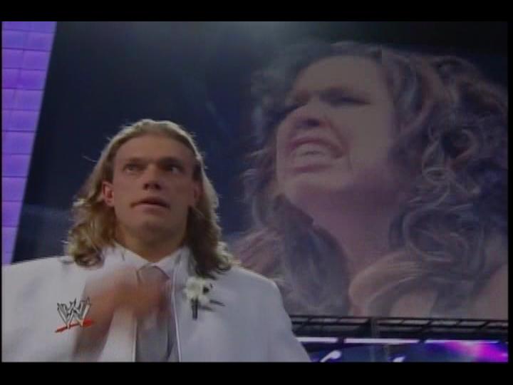 番組の最後にエッジがヴィッキーとの今までまとめたビデオを流してるところに、ようやくHHH登場。