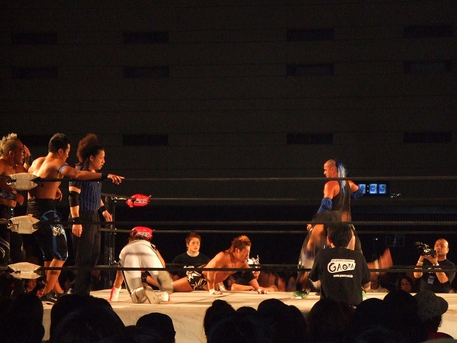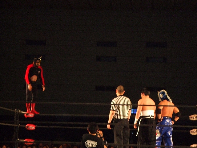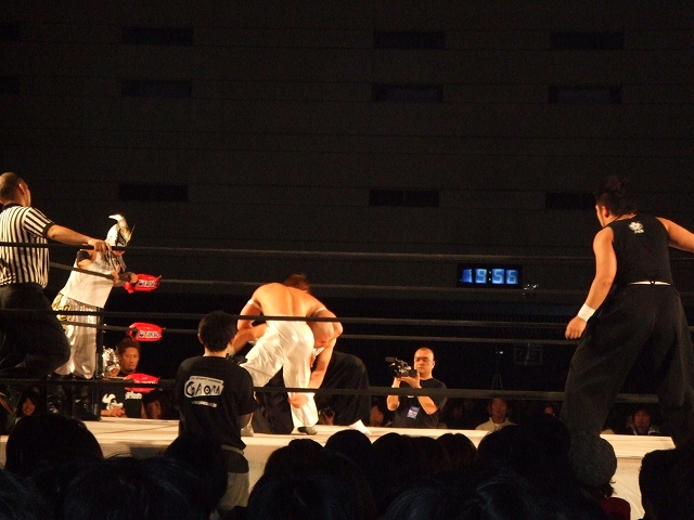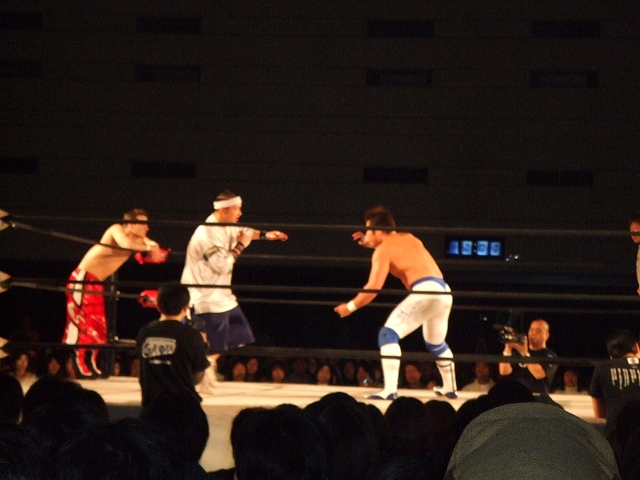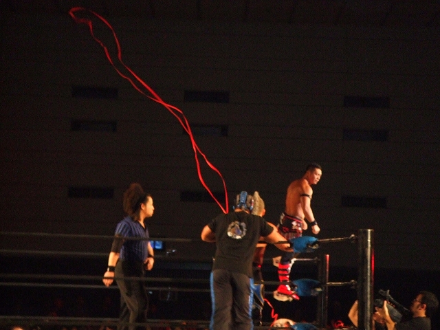 3.3 大阪大会(ドラゲー) 早速ですがSUWA FINAL行けることになりました。 12日を仕事休みにしてもらったんで、11日に試合観戦して東京泊。 向こうでは親戚の家に泊まることにするんで、宿泊代はタダ。 次の日青春18切符を使って、途中名古屋城とか寄りーの、のんびり大阪に帰ります。 というわけで、費用は 行きの夜行バス(5900円)+チケット代(8000円)+18切符代(2000円)=約16000円。 前回の試算より1万円以上安くなった!( ̄∀ ̄)v ブイ さて、今日はドラゲー大阪大会。 あいかわらず満員の府立体育会館、第2競技場。 前回のノア興行より客数は多い。 もちろん会場が違う分キャパも違うねんけど、それでも1インディー団体としては相変わらずすごい集客力ではある。 試合前に、"Me Gusta Cola"のテーマがかかりCIMAとそのユニットメンバーが登場。 メンバーはCIMA・享・斎了・キッド・王子・ハルク。 マイク担当はCIMAと斎了。 2人ともマイクが上手い。 声も聞き取りやすいし、間もいいし。 他の団体もこの辺大事にして欲しいわ。 今日は新ユニット名発表ということなので、ドラゲー恒例の巻物でユニット名発表。 その名前は"Typhoon"(タイフーン)。 まあ微妙だとは思うけど、Do Fixerも悪冠一色もファイエムも最初はしっくりこなかったけど、段々馴染んできたから、この名前もいずれしっくりくると思う。 そしてユニット名発表後、メインイベントのなにわ式イリミネーションマッチの話になったところでマッスル登場。 当然両方とも先攻がいいわけで、CIMAとGammaの言い争いで決まらない中、クネス登場。 公平を期すために封筒を引いて、○が書いてれば先攻、×なら後攻。 ユニットとユニットの対抗戦のわりには、相変わらずのどかな決定方法だ。 Gammaが強引に先に封筒を取り、タイフーン側はCIMA曰く"一番強運の持ち主"のキッドがひくことに。 結果はマッスルが"○"のため、先攻はマッスル。 続いて、レフェリー決めもくじ引きで。 CIMAは"これもハズレやったらキッド首やで。"って厳しいなぁ。(  ̄▽ ̄) Gammaとキッドが再度封筒を選ぶも、キッドはまたもやハズレ。 結果、なにわ式イリミネーションマッチはマッスル先攻で、玉金レフェリー。 この試合前のやりとり、結構長かったけど一番おいしかったんはキッドやなぁ。 第1試合 もっちー&フジイさん&ターボマン対岸和田兄さん&Dr.マッスル&サイバー・コング 試合は、体が小さいターボマンが捕まってしまう試合展開。 しかし兄さんのコーナーへ振ってのスプラッシュは迫力満点。 力技も空中技もハードコアもできるし、後はマイクが上手ければすごいねんけどな。 試合中も"殺すぞ、オラ~!"、"オマエ、死ねや!"が多いのがいつも失笑してしまう。(;¬∀¬)ハハ・・ "オマエら、LRや!"は好きやけどね。 そして、ドラゲーらしく第1試合からお客さんのあったまり方も早い。 もっちーもここ一番でしか見せないノータッチプランチャも見せてたし、最後はフジイさんのナイスジャーマンでDr.マッスルからピン。(*^ー゚)b グッジョブ!! ところで今日のDr.マッスルは誰やろ? 体が小さめやったし、この前のサイト神戸のときとは明らかに別人のような気もする。 NEXの選手の育成枠か?とも思わせる。 試合後にサイバーコングが英語で、もっちーに宣戦布告。 吉野が通訳(?)して、もっちーも受諾。 しかし、サイバーコング対もっちーのシングルがそんなに楽しみな客はいないと思うねんけど。 もしかして津市まで引っ張る気なんか? 第2試合 クネス対戸澤対ストーカー市川Z ま、試合はいつもの市川ワールド(笑) いっちゃんを絡めずに、試合をしようとするクネスと戸澤。 一生懸命絡もうとするいっちゃん。 最後は、イスを持ち出したいっちゃんがロープに跳ね返ったイスが自爆。 WWEではカートが上手だった技。 そこに戸澤がフォールして3カウント。 第3試合 カツオ&神田対m.c.KZ.&ジャック・エバンス そういえばカツオとジャックを見るのは久しぶりかも。 最初はKZのお約束ムーブが神田に決まる。 一応NEXの選手の中でも、一番本隊の興行に参加してるし、サンボーホール・サイト神戸・大阪府立と見てきたけど、キャラも出来てて、独特のムーブもあり、それなりに人気もでてる。 実際、この試合の主役はジャックでなくKZ。 途中で見せたフロッグスプラッシュは綺麗。(*゚▽゚ノノ゙☆パチパチ 最後はカツオのFUっぽい技からの神田の下剋上エルボーで3カウント取られたけど、別に勝敗関係ないし。 残念だったのはジャックの630が見れなかったことかなぁ。 今日のジャックは影薄かったね。 第4試合 超神龍&B×Bハルク対岩佐拓&アラケン 一番期待外れてしまったのはこの試合かも。 岩佐とアラケンというプロレスIQの高い二人が組んでるのは、楽しみが増えるとは思うけど、この試合に関しては、序盤中盤までは見せ場があまり無かった。 終盤にかけては二人の連携が見れたけど、それまでが少し退屈に感じた。 最後は岩佐の戸澤塾最終奥義・熨斗紙から、アラケンの飛び出し注意フットスタ
