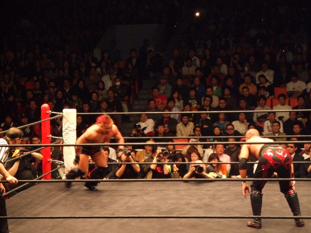 場外では客席までもつれあい、SUWAがブレーンバスターをしかけるが逆に返される。