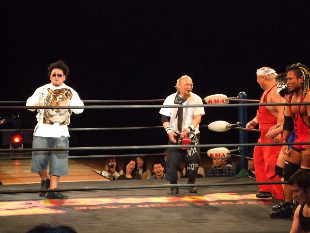 13時から試合開始ということで、JUNが本日の試合順を発表後ブラザー率いる南京"ファッキン"レスリング部のMC。