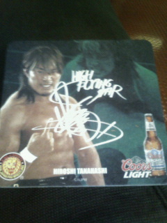 会場に着いたものの、飲み物を買うのを忘れてたので、クアーズビールを買って棚橋のコースターをゲット。