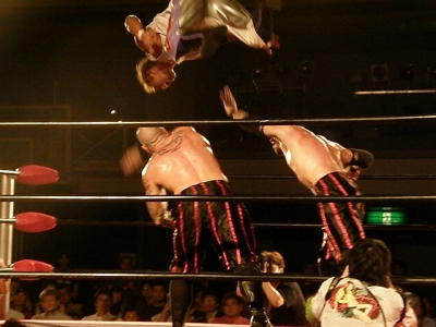 享がブリスコをリング上でエクスプロイダーの状態に捕らえると、信悟が享ごとバックドロップで投げたりと信悟と享の連携が決まる。