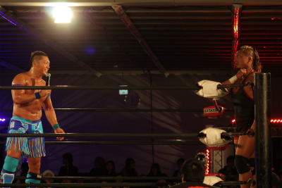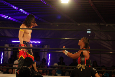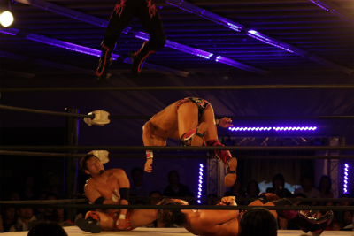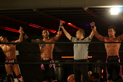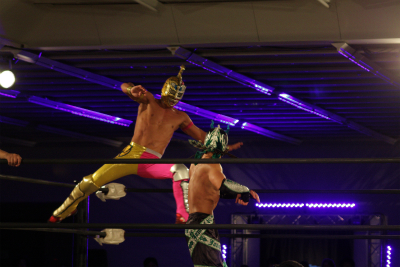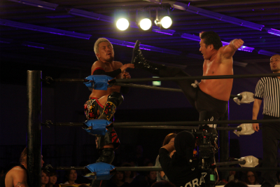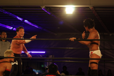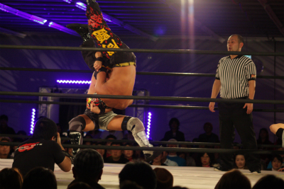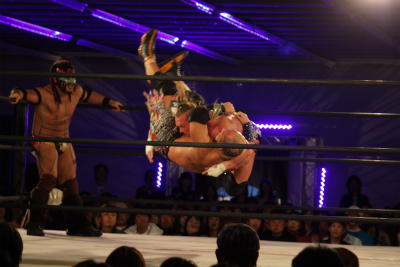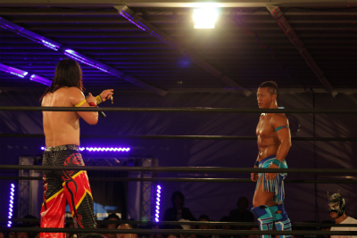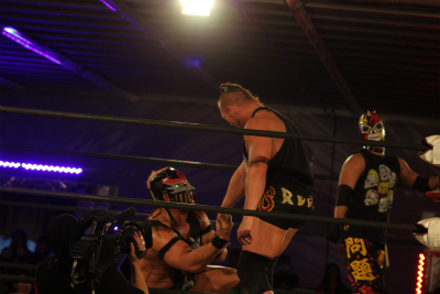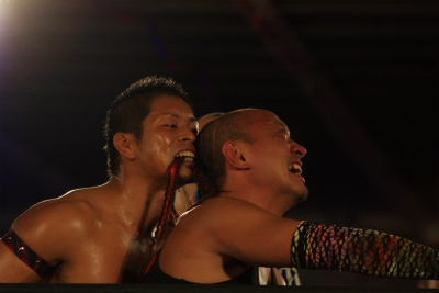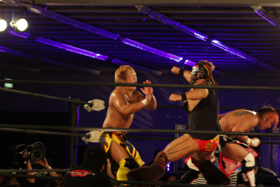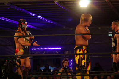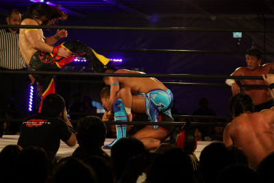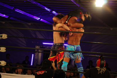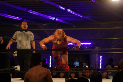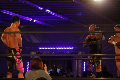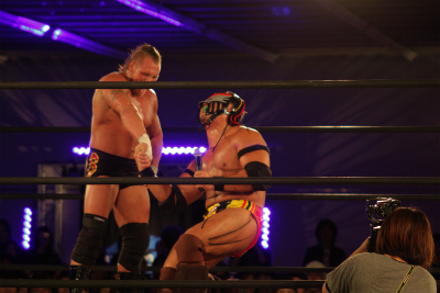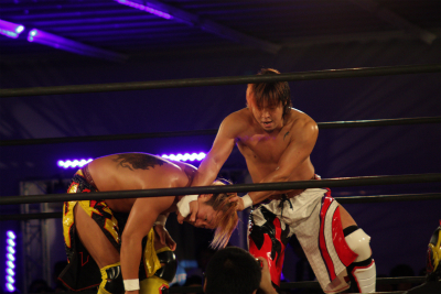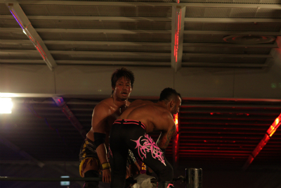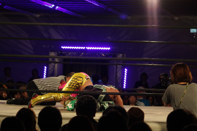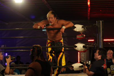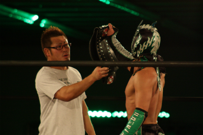 DRAGON GATE 神戸大会終了!メインでリコシェとやり合ったジミーズのMr.キューキュー・豊中ドルフィン選手です!今大会はGAORAにて22日夜8時30分からオンエアです!! photozou.jp/photo/show/287…
