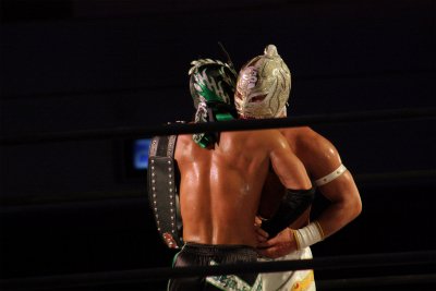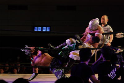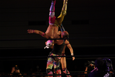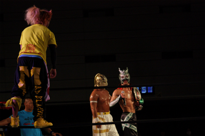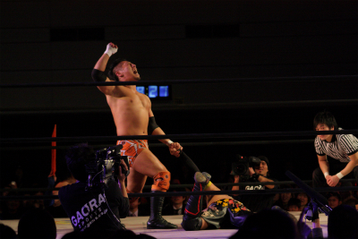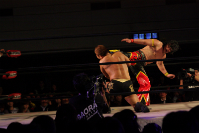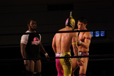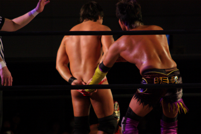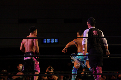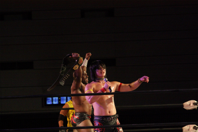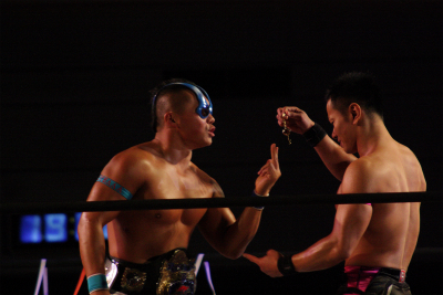 キッド薄氷の防衛戦~3.2 大阪チャンゲ1日目まとめ~ チャンピオンゲート1日目のメインはキッド対HUBのベテラン軍同門対決@ブレイブゲート。 蛇が龍を飲み込むか? 第1試合前に明日のドリームゲート選手権試合の公開調印式が行われる。 吉野とCIMAがそれぞれサインをして意気込みを語る。 「明日はドラゴンゲートで見たこともないような景色をお見せします。」(吉野) 「吉野はパーフェクトで来るやろうけど、オレは何かオマエを上回る武器をもって臨むからな。」(CIMA) 第1試合 戸澤陽&Kzy&問題龍 VS 斎藤“ジミー”了&ジミー・神田&ジミー・カゲトラ 戸澤のテンションが非常に高く、この日はトペスイシーダ3連発を見せた。 相手にも斎了という盛り上げ上手がいただけに1試合目から盛り上がった試合。 最後は戸澤がデッドリフトジャーマンで神田からピン。 試合後に戸澤がウーハー・ネイションを呼び込む。 ウーハーはいつものジンギスカンの曲で入場。 そしてハルクがモチフジを呼び出して舌戦を展開。 今日のハルクはもっちーに「オマエにしちゃ中々いいマイクじゃねえか」とお褒めをいただいてました。 今年に入ってからマイクが増えたハルクだけどもうあまり違和感ないかなぁ。 キッドも最初はマイクに不安ありまくりだったけど、今はもうマイクがヘタというイメージはないもんね。 第2試合 土井成樹&しゃちほこBOY VS 堀口元気H.A.Gee.Mee!!&Mr.キューキュー・谷嵜なおき・豊中ドルフィン 試合はしゃちがオリオンで谷やんからピン。 試合後土井ちゃんはしゃちをハグして勝利を祝福。 そしてその勢いでしゃちはジミーズに対してトライアングルゲート王座奪取を宣言。 第3試合 鷹木信悟&YAMATO&三代目超神龍 VS ジミー・ススム&サイバー・コング&琴香 前回の神戸と同じくがむしゃらに超神龍だけではなくYAMATOや信悟に突っかかっていく琴香が良かった。 結果は超神龍のスワンダイブ式ギロチンで負けたものの何かを掴んだんじゃないですかねぇ。 第4試合 CIMA&スペル・シーサー VS 吉野正人&リッチ・スワン ドリームゲートの前哨戦ということもあり、CIMAと吉野はどちらかといえば様子見の展開。 シーサーとスワンの攻防メインで行われた試合は、吉野のミサイルセントーンからスワンがその場飛び450°スプラッシュでシーサーから勝利。 試合後テンションの上がってきたCIMAは吉野に 「まだやり足らんな。 今からシングルマッチやってもええねんぞ」(CIMA) 吉野もそれに乗ると、CIMAと吉野がリングで対峙して土井ちゃんをレフェリーとしてシングルマッチを行おうとする。 ゴングが鳴らされたが、CIMAはすぐに場外へ出てバックステージへ退がる。 そして前半戦は吉野が締め。 久しぶりに土井ちゃんの暴走レフェリー見たかった(笑) 第5試合 オープン・ザ・ツインゲート統一タッグ選手権試合 《王者組》望月成晃&ドン・フジイ VS 《挑戦者組》B×Bハルク&ウーハー・ネイション 久しぶりに見たウーハー・ネイション。 ケガで長期欠場してたけど、今日の試合見る限りケガの影響なんかはなさそう(笑) モチフジはウーハー&ハルクのパワーに押され気味の展開が続くと、最後はウーハーがウーハーコンビネーション(その場飛びムーンサルト→その場飛びシューティングスタープレス)でもっちーから3カウントを奪う。 ツインゲートはMBが奪取。 メインイベント オープン・ザ・ブレイブゲート選手権試合 《王者》ドラゴン・キッド VS 《挑戦者》HUB HUBはキッドの空中技封じにヒザを集中攻撃。 キッドと対戦するレスラーが足を狙ってくることは定番とはいえ、今日のHUBの攻め方は非の打ち所がないくらい流れるように技を決めていく。 打撃と関節技を織り交ぜてキッドに反撃の糸口を掴ませない。 全く自分の流れを作れなかったキッドは619でHUBを場外に落として、さらに実況席越え(ちょっと見えなかった?)のケブラーダで打開を図る。 しかしリングに戻るとまたHUBの尻尾攻撃もあり劣勢に戻されてしまう。 HUBは雪崩式ペディグリーから亜留魔下首領と大技連発で試合を決めにかかる。 カウント2で返されると、フィニッシュとばかりに猛毒波布空爆を敢行するもキッドは剣山で迎撃。 一発逆転を狙ったキッドはウルトラ・ウラカン・ラナを狙うが、HUBはこれを耐えてパワーボムの体勢に担ぎ上げる。 しかしキッドが再度ウラカン・ラナで丸め込むと3カウントが入る。 ブレイブゲートはキッドが王座防衛。 試合後なぜかKzyと問題龍が登場。 「ブレイブに挑戦したいのか?」(キッド) 「いや。 オマエらのチームの熱い試合の空気ぶち壊しに来ただけ。 HUB残念だったねー。」(Kzy) 一通り喋ってKzy&問題龍退場。 ホントに何しに出てきたんだ? その後キッドはHUBと辰と巳で新旧干支タッグを結成。 そしてキッドはHUBにマイクを渡すとHUBは涙ぐみながらマイク。 「今日の3月2日は自分がデビューした日です。 そんな大事な日にドラゴンゲートであなたとタイトルマッチが出来るとは思いませんでした。 自分が今リングに立てているのは昔