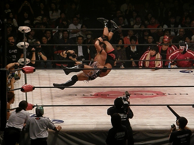 圧巻はコーナーへ後ろ向きに登ったジェネリコに対して、ジャンプでコーナートップまで上がり、そこからのリバースフランケンシュタイナー。