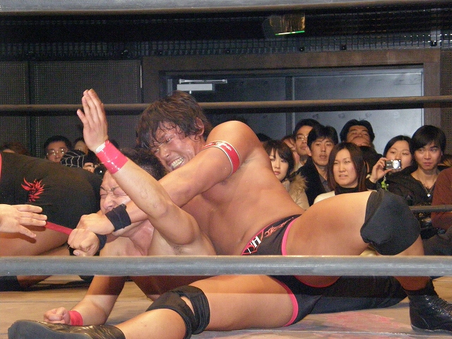 2008年ドラゲー初め~1.13 SITE-KOBE・PRIMAL GATE~ 今日は2008年最初のプロレス生観戦。 いつもとは違い今日は15時から試合開始なので、昼過ぎにリングソウルで2月開催のエルドラド@デルアリと、1月26日の全日本プロレスファン感謝デーのチケットを買って、SITE-KOBEへ。 着いてみると、相変わらずの人の多さ。 チケットは80番台だったのに、既にリングサイド2列目くらいまでは埋まってしまってるし。 というわけで、今日はマトモな写真はないですね。 全体を撮ろうと思うと、どうしても前の人の頭が写ってしまうんで 第1試合 CIMA&キッド&享&王子対アラケン&岩佐&戸澤&カツオ 今日が復帰戦となった岩佐。 試合を通して見てみても、8人タッグだったってのもあるかもしれないけど、そんなにブランクは感じさせない動き。 試合でもキッドと享を逆エビ固めとキャメルクラッチの体勢に決めておいて、そこへアラケンがドロップキックを見舞っていったりと連携技も増えてる。 これなら、新岩タッグで再度ツインゲートを狙っていけそう。 それ以外で目立ってたのは、カツオとCIMAのやりあい。 特にCIMAはいつもにまして厳しい攻めを、トザカツに向けて決めていく。 厳しいというのは身体的な攻めは当然のこと、今日のCIMAは口でも厳しい攻撃をしてたね。 最後はCIMAがリバースのWARスペシャルのような変形羽根折り固めでカツオがタップ。 試合後のCIMA "まずは岩佐、復帰おめでとう。岩佐の復帰は戸澤塾にとっても、ドラゴンゲートにとっても大きいよ。"(CIMA) "でも次に試合するときは、タイフーン全員でオマエの腕狙っていくから。"(CIMA) "ただ今日の試合は戸澤塾対タイフーンの全面対抗戦ちゃうぞ、タイフーン対新岩その他じゃ。"(CIMA) その後カツオも突っかかっていくが、CIMAはスカす。 そしてタイフーンが去った後に、復帰戦だった岩佐からのマイクでも、戸澤とカツオに対してもう少し頑張れと叱咤激励。 そして戸澤が一言。 "これからも頑張って・・・太っていきます!"(戸澤) "え~~~~!"(客) "それしかねぇだろ!"(戸澤) 素晴らしい逆ギレっぷり。 これだけ開き直られると、逆に清々しく思えてくる。(笑) 今日のCIMAは何かあったのか、トザカツに対して試合を通して厳しい態度。 第2試合 もっちー対ジャクソン対ストーカー市川 試合は途中にもっちーの蹴りでジャクソンの杖が壊れてしまうが、それはそれで楽しい時間を作る3人のレスラー+レフェリー1人。 最後はもっちーが壊れた杖の一部で玉金の頭を小突いて、もっちーの反則負け。 もっちーはなぜかこの試合で手のひらから出血してたんだな。 ※もっちーが自身のブログでこのことについて書いてます。 第3試合 YAMATO&信悟対ルパン&m.c.KZ. 試合は終始ニューハザード組が3枚くらい上手の試合運びで、終わってみれば余裕の試合。 特にこの試合で大きく見えたのは信悟ではなくYAMATO。 元々、ルパンやKZと同じNEX勢だったのに、今日の試合を見てる限り、現段階ではルパンとKZとの差はまだ大きいようにも感じたし。 普段は信悟やハルクと一緒にいるから目立ってないけど、体も確実にビルドアップされていってるし、試合の中で誤爆してしまったけど信悟に対して決めたスピアーは迫力もあった。 試合中に所々天然を思わせる面を多く覗かせるけど、それはそれで面白いからいいとしよう。(笑) 最後はYAMATOがギャラリアでKZからピン。 試合終了後にKZが悔しそうにリングを叩き付けたのも少し印象的。 第4試合 神田&吉野&Dr.マッスル対土井&Gamma&元気 ヒール同士の対戦といえば、闘龍門時代に悪冠一色の大鷲対ドッティ修司を思い出すけど、結局その時は両者によるレフェリー暴行になってしまったんで、この試合もドッチラケで終わってしまうのかと思ってたけど、普通に何の文句も言わずに試合をしてたな。 試合の序盤に、神田と元気・ドクターとGammaの攻防が終わった後、待望の土井と吉野が出てくるとお客さんの歓声もスゴイ。 しかしその歓声をかき消したのはGamma。 いきなり背後から吉野を襲い、何と吉野に唾液攻撃を見舞う。 しかし吉野も体勢を入れ替えると、Gammaに対してうがい攻撃。 その後は普通に両チームとも激しい攻防を見せ、途中に吉野が土井ちゃんに向けてタッチしようとするシーンもありながら、最後はパウダー攻撃(どちらのチームがしかけたのかは不明。)から元気がバックスライド・フロムヘルでドクターからピン。 試合後も特に何のマイクもなく去っていく両チーム。 マッスルアウトローズ同士の試合ということで、試合自体は面白かったんだから、できれば試合前か試合後にマイクも欲しかったところ。 第5試合 サイバーコング&サイバー・リョウ対BBハルク&BBフジイ Xは前回の予想通り、斎了とフジイさん。 両チームのセコンドには信悟とYAMATO。 試合ではサイバー組は連携を見せるけど、BB組は特に連携技はなし。 途中にサイコンがハルクに対してリフトアップスラムを見せると、サイリョウが"オレも、オレも!"ってタッチを要求して、結局出来な