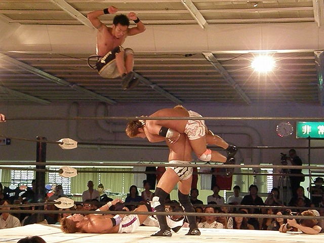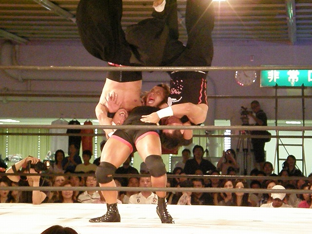 信悟は新岩2人まとめてブレーンバスターで投げると、キッドも場外に向けてバミューダトライアングルを決めていく。